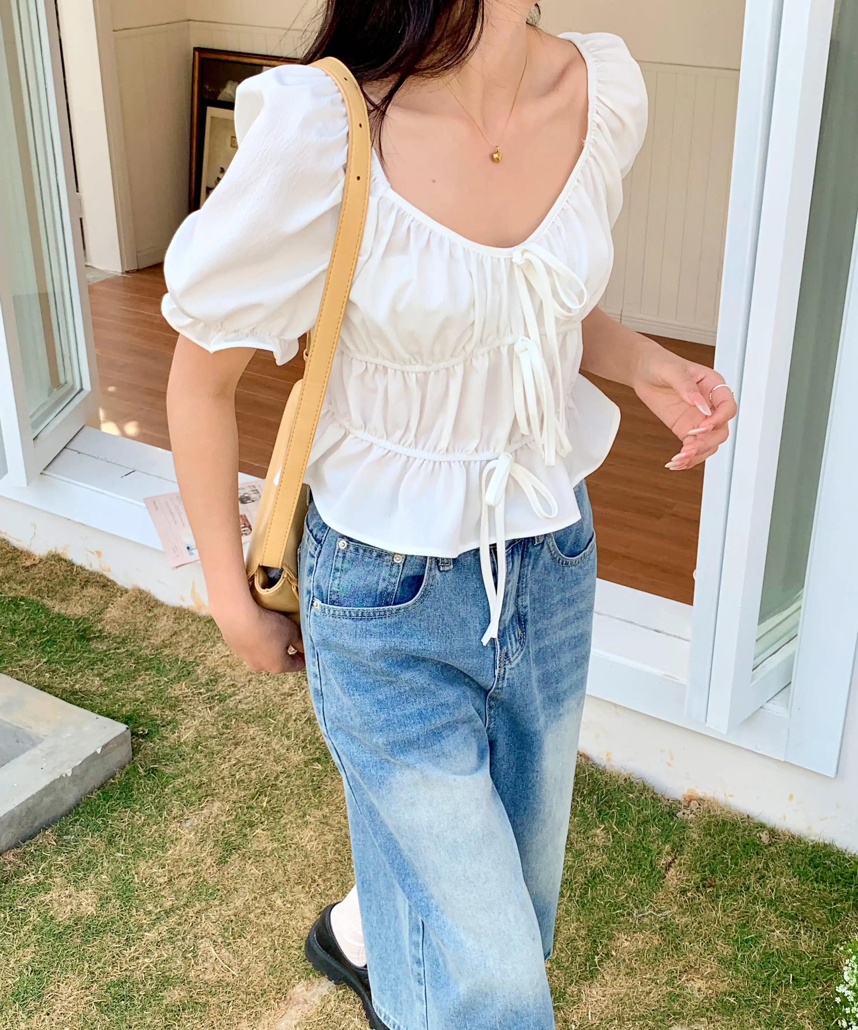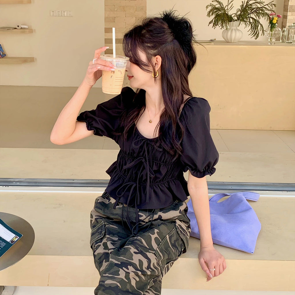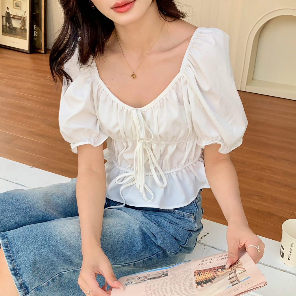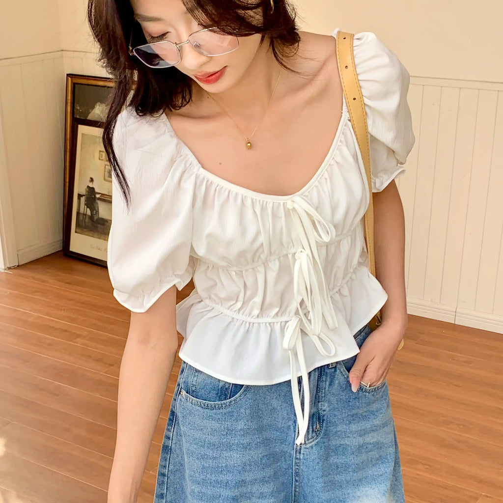 Purpdrank Spring Summer Lace-up Ruffles Women's T-Shirts 2025 New French Style Elegant Puff Sleeve Short Shirt Tops for Womens