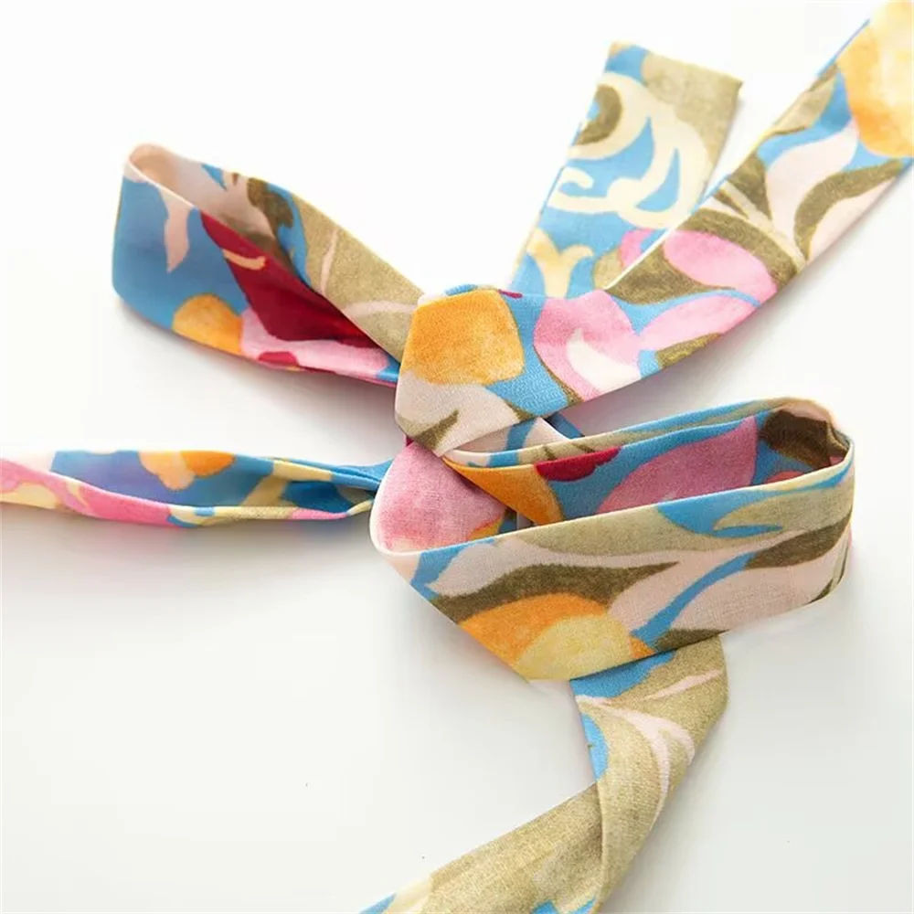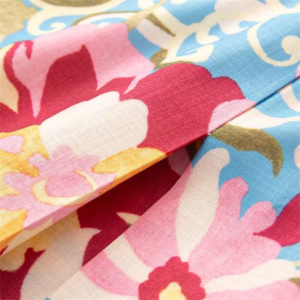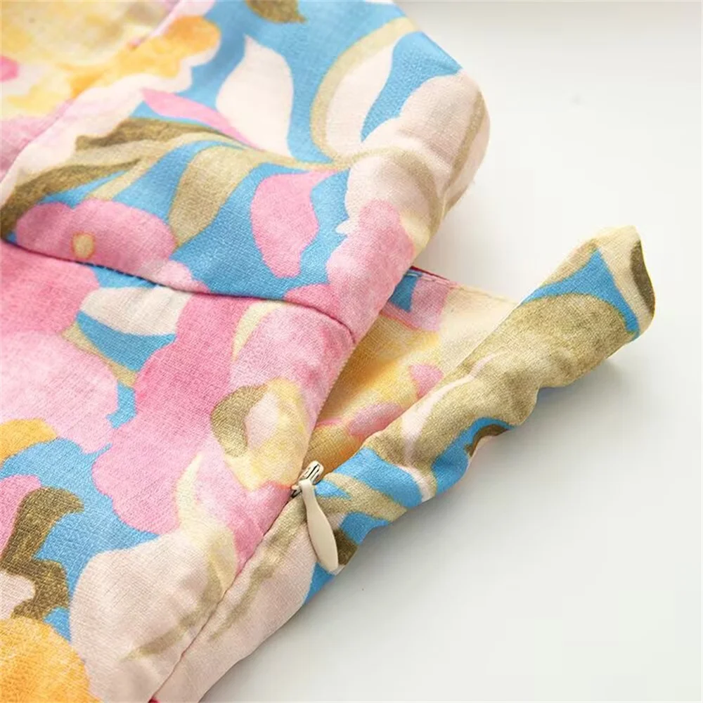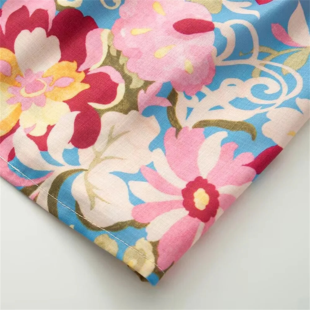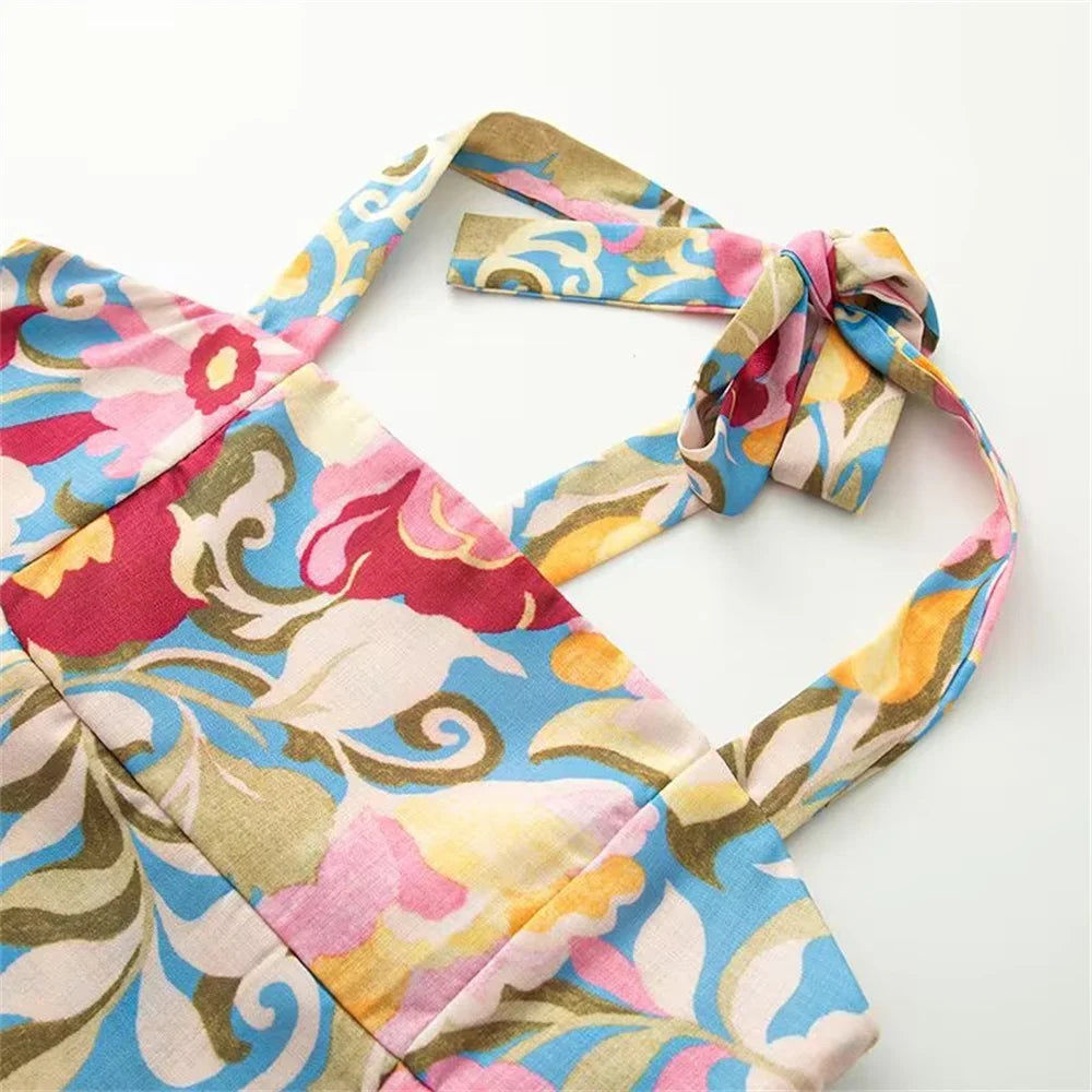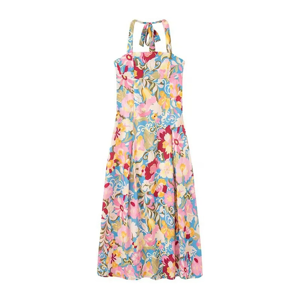 Purpdrank Summer New Product Women's Linen Blended Printed Hanging Neck Strap pleated Long Skirt Midi Dress
