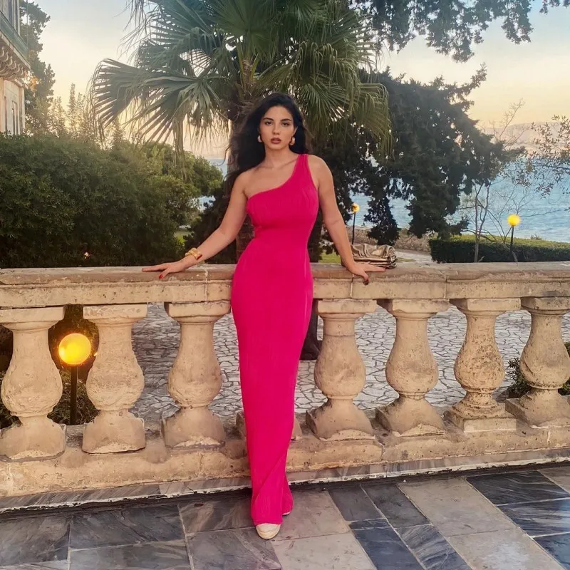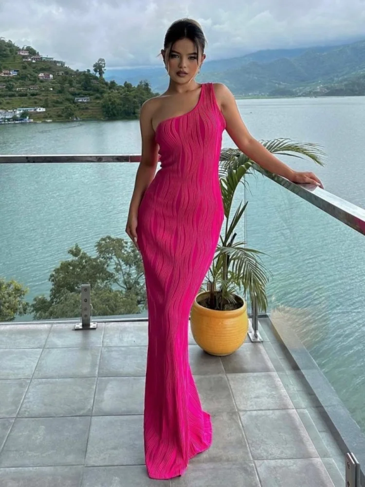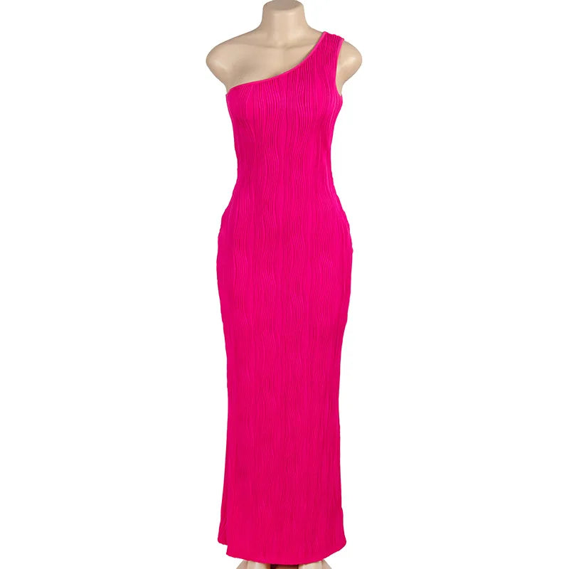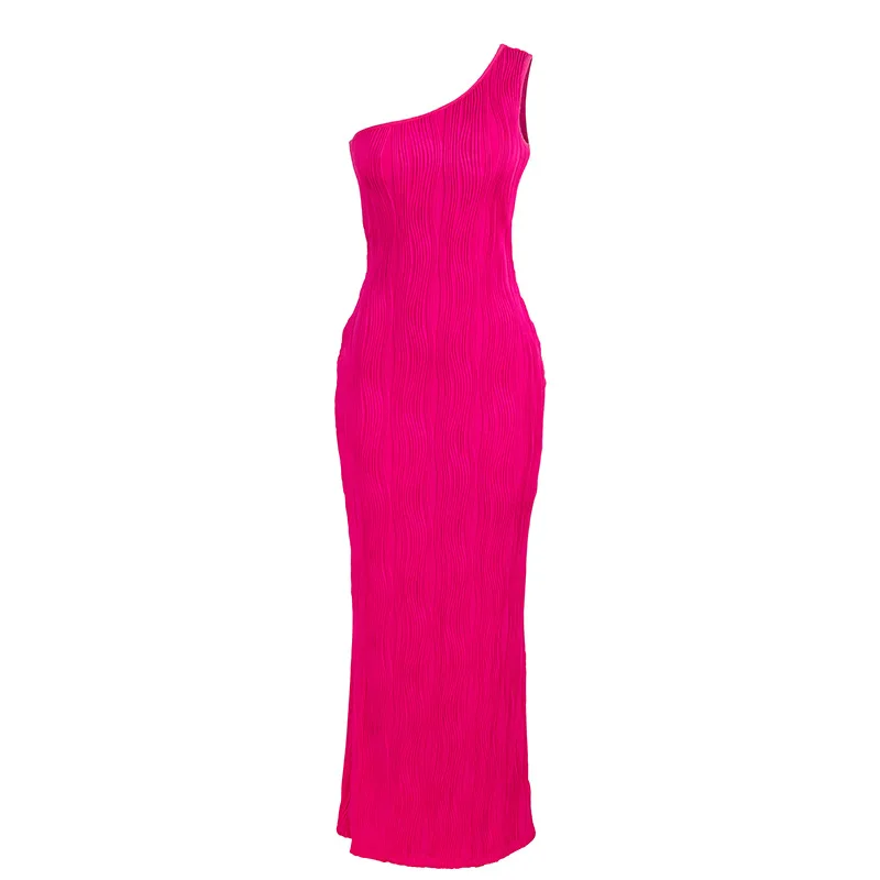 Purpdrank summer new solid color sleeveless one-shoulder water ripple long slim-fitting women's dress