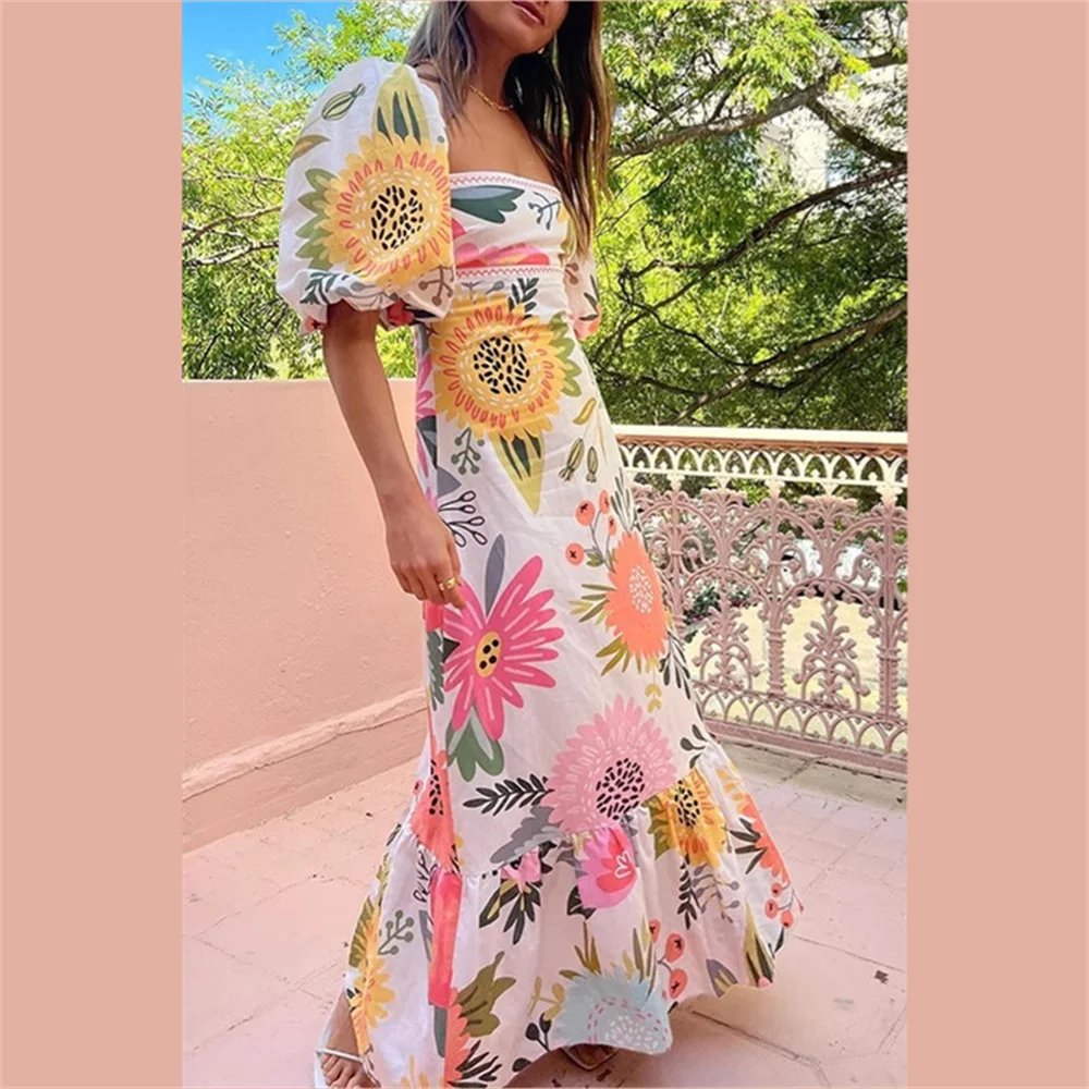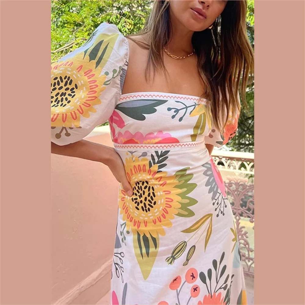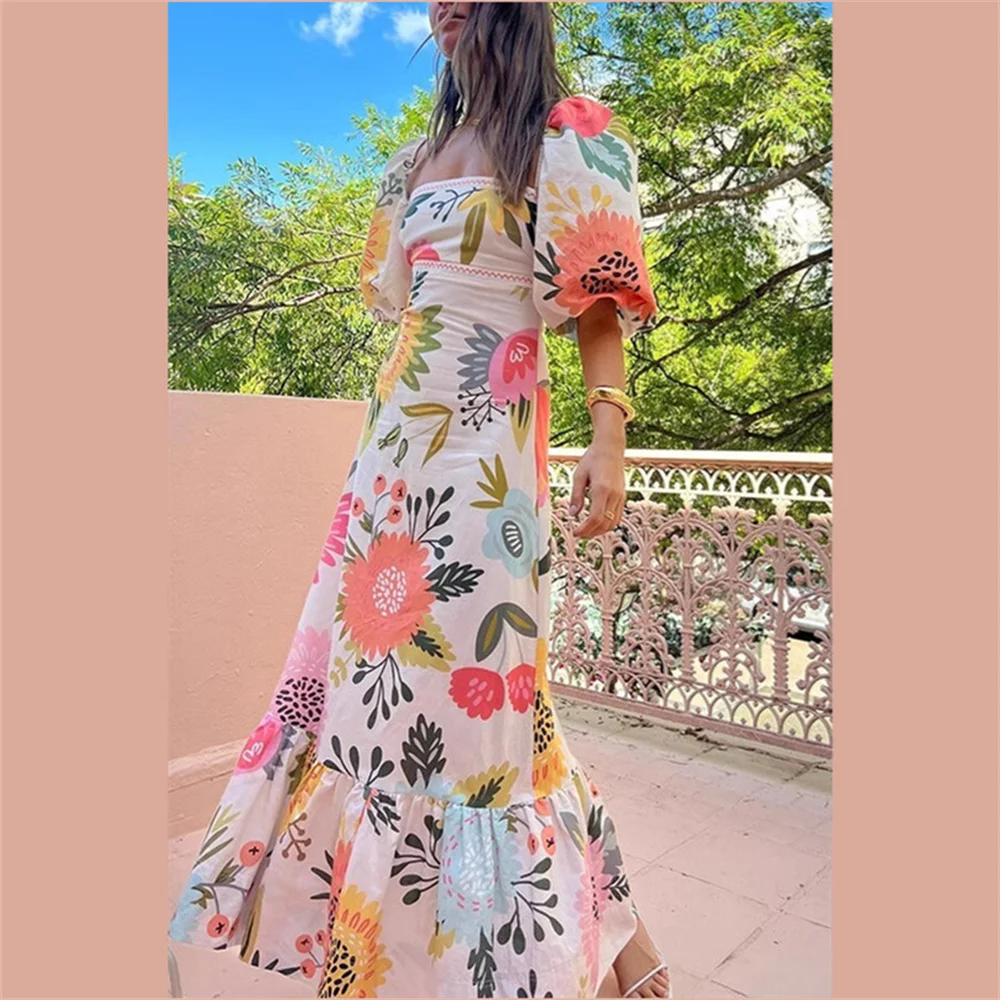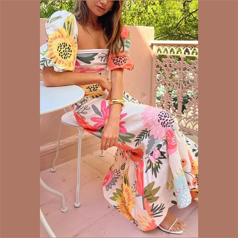 Purpdrank Summer New Women's Fashion and Elegance Slim Fit Versatile Printed Embroidered Square Neck Dress