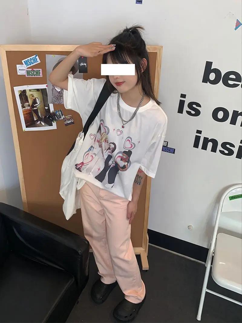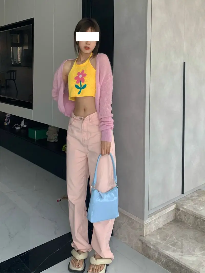 Purpdrank Sweet Cool Hot Girl Pink Straight Jeans Women High Street High Waist Slim Cigarette Pipe Wide Leg Trousers Pants
