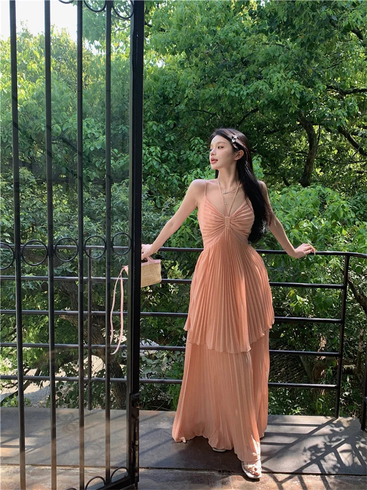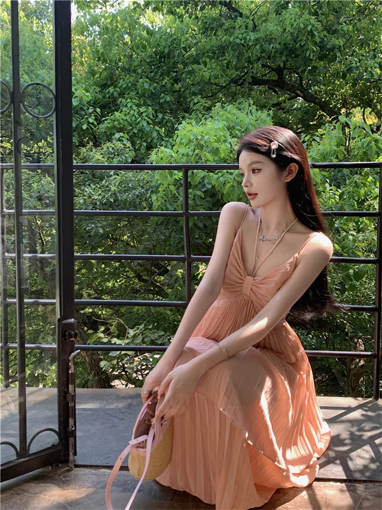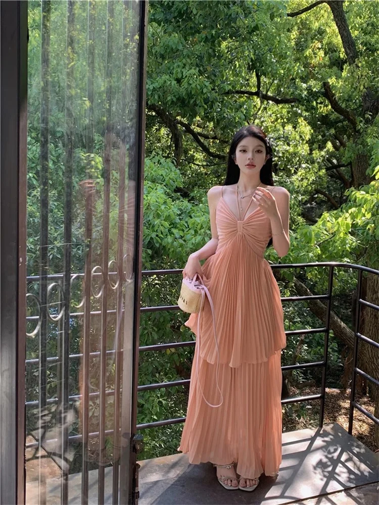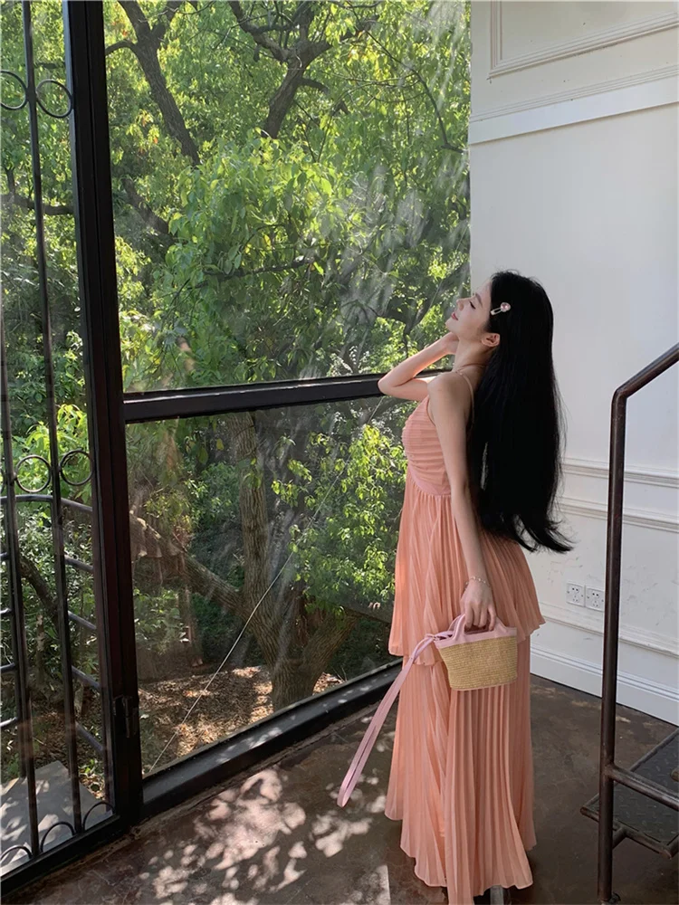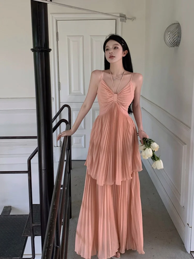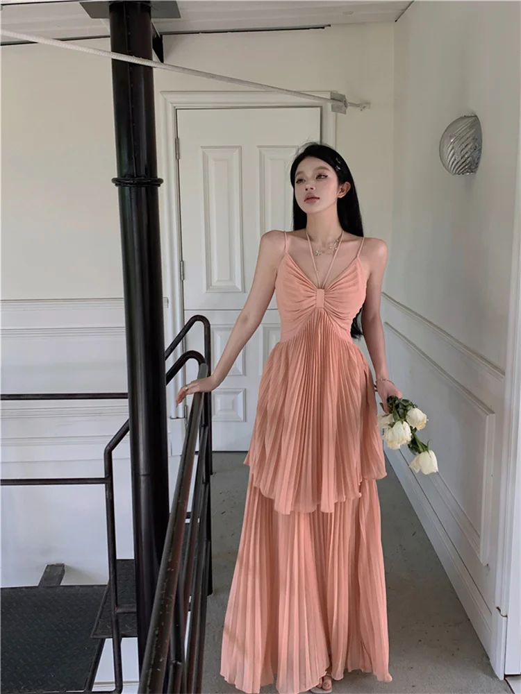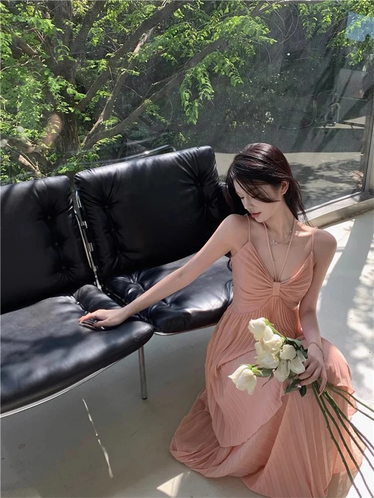 Purpdrank Sweet V-Neck Pink Dress Women Spaghetti Straps Sleeveless Chiffon Pleated Casual Beach Dress Sexy Slim Long Dress