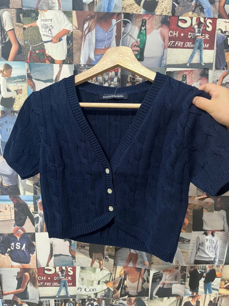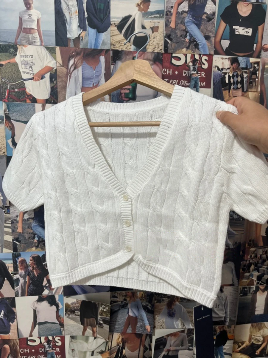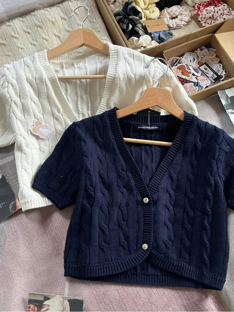 Purpdrank Twist Flower Knitted Cropped Cardigan T-shirt Women Sexy V-neck Single Breasted Short Sleeve Tees Vintage Simple Cotton Crop Top