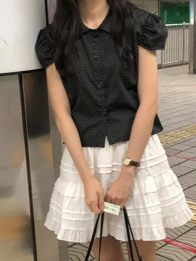 Purpdrank Vintage Dots Printed Puff Sleeve Women's Blouses 2025 New Summer Elegant Single Breasted Casual Short Shirts Tops Female