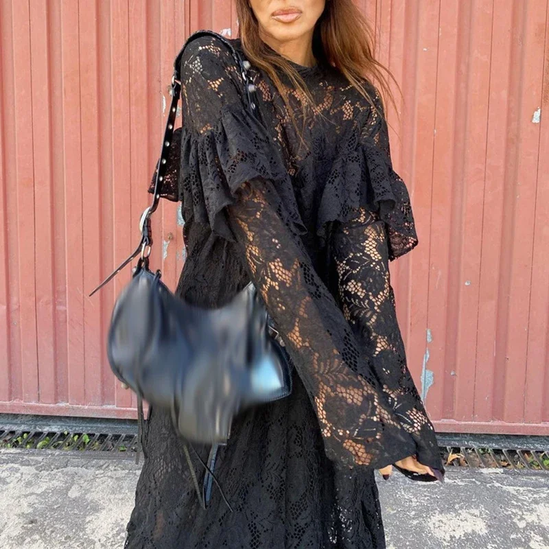 Purpdrank Vintage O Neck Embroidery Ruffle Stitching Lace Mesh Long Dress Women Sexy Hollow Perspective Loose Party Dresses for Women New