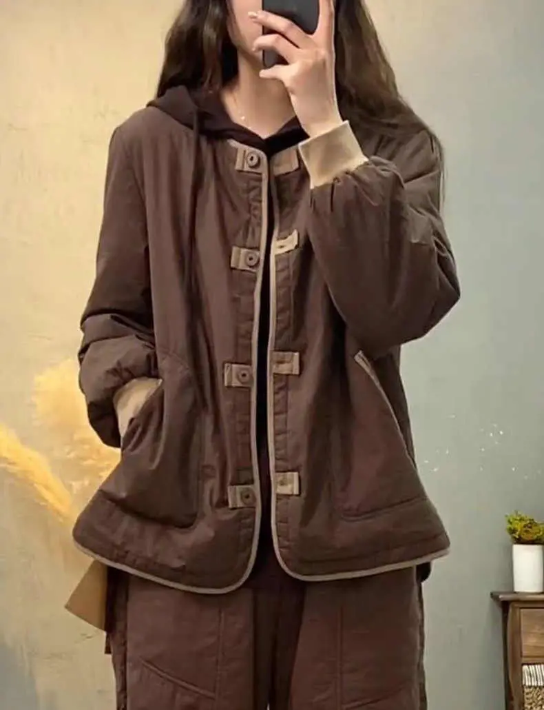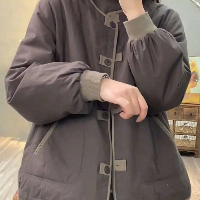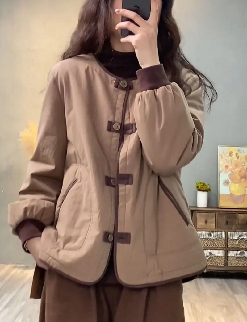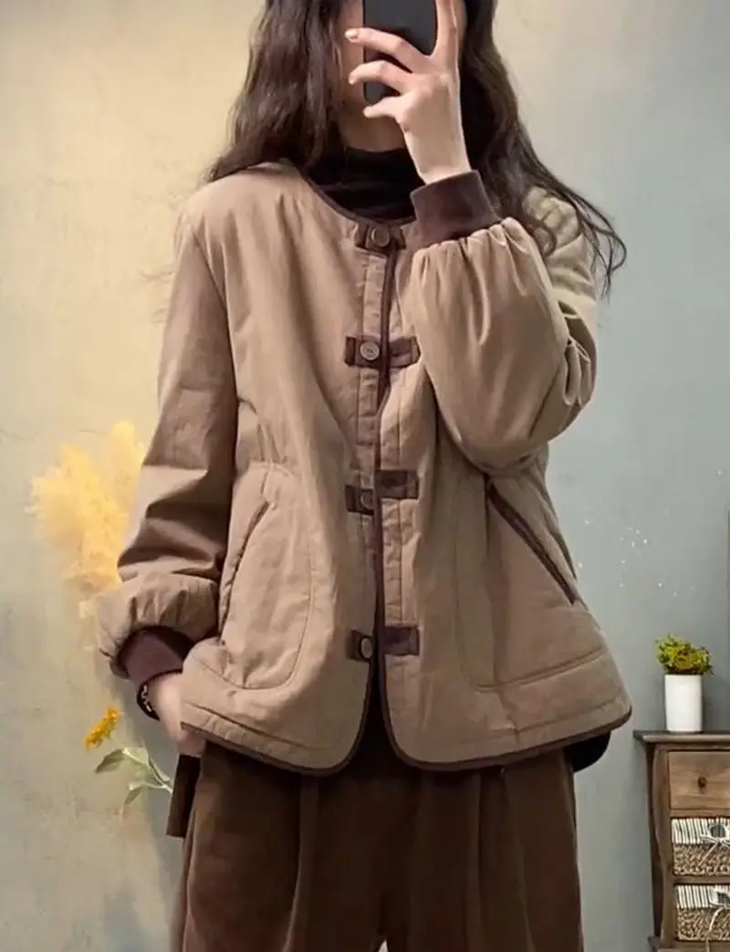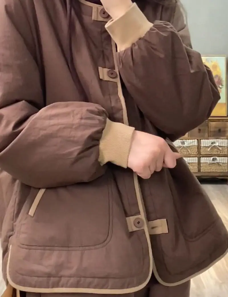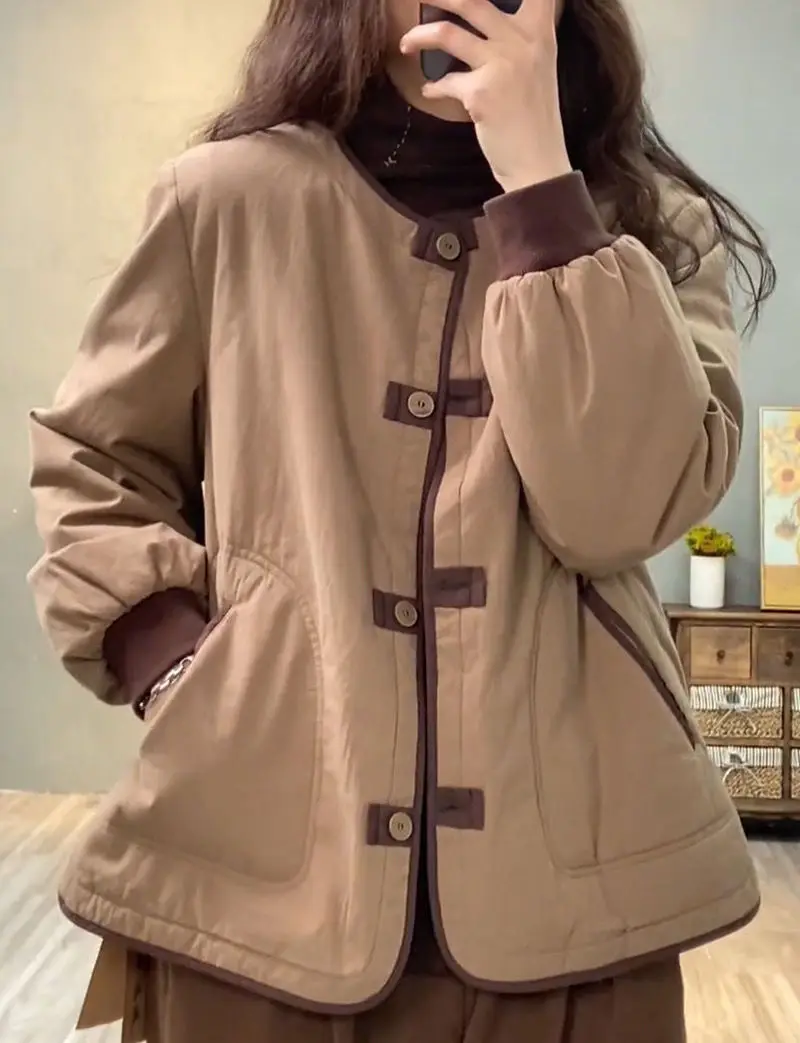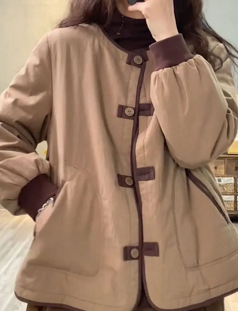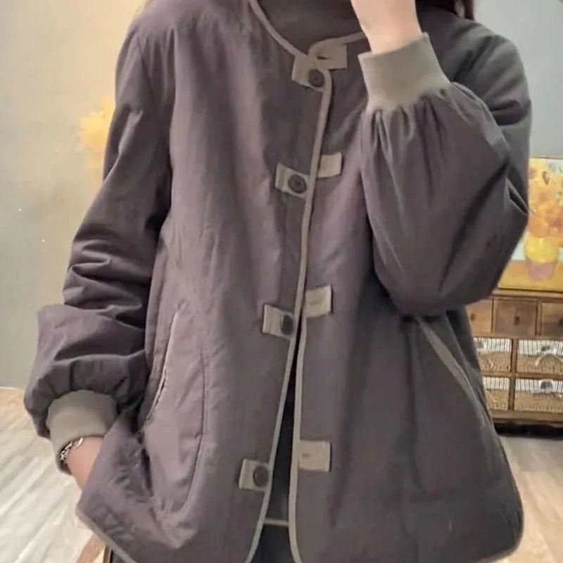 Purpdrank Vintage Patchwork Cotton-padded Jacket Winter Women's Clothing Warm Parkas Long Sleeve Coat Single-breasted Pockets Short Tops