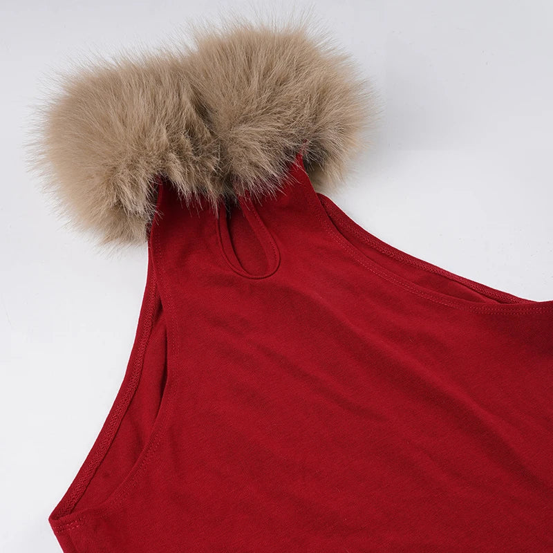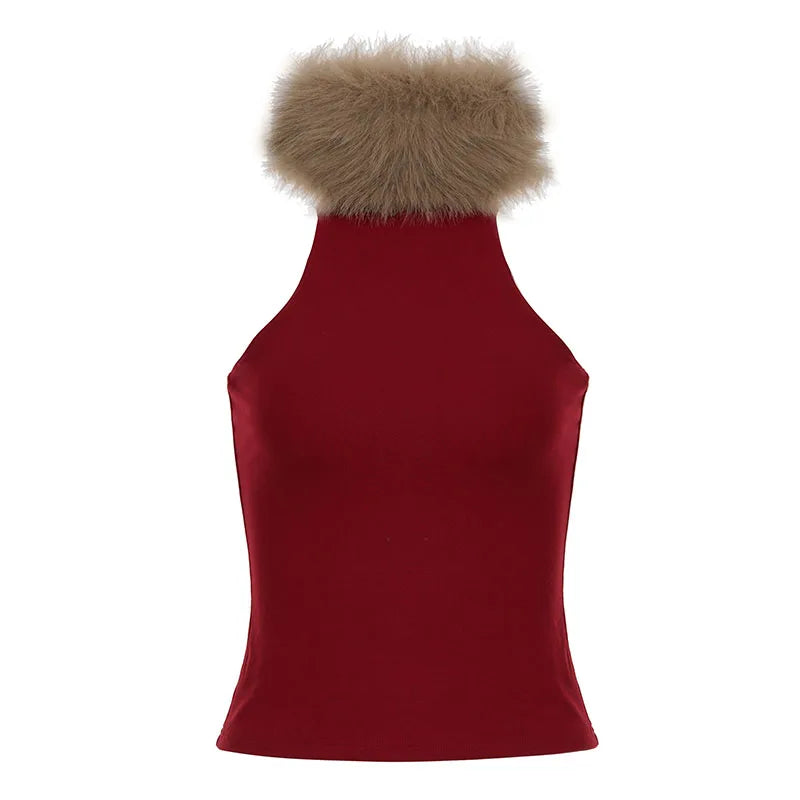 Purpdrank Vintage Patchwork Fur Trim Collor Tank Tops Christmas Hollow Out Sleeveless Tanks Women Summer Fashion Streetwear Party