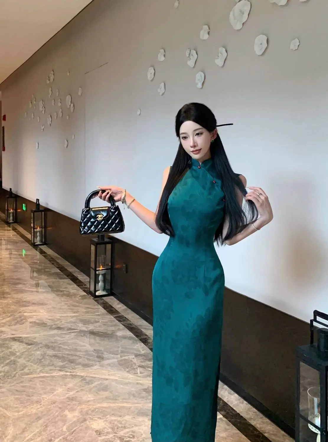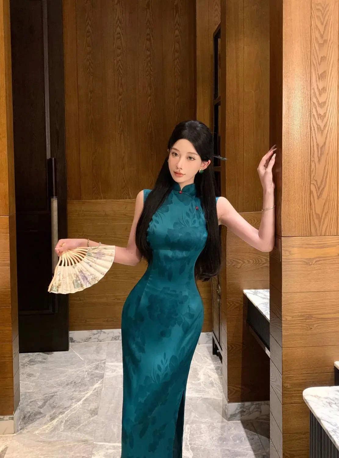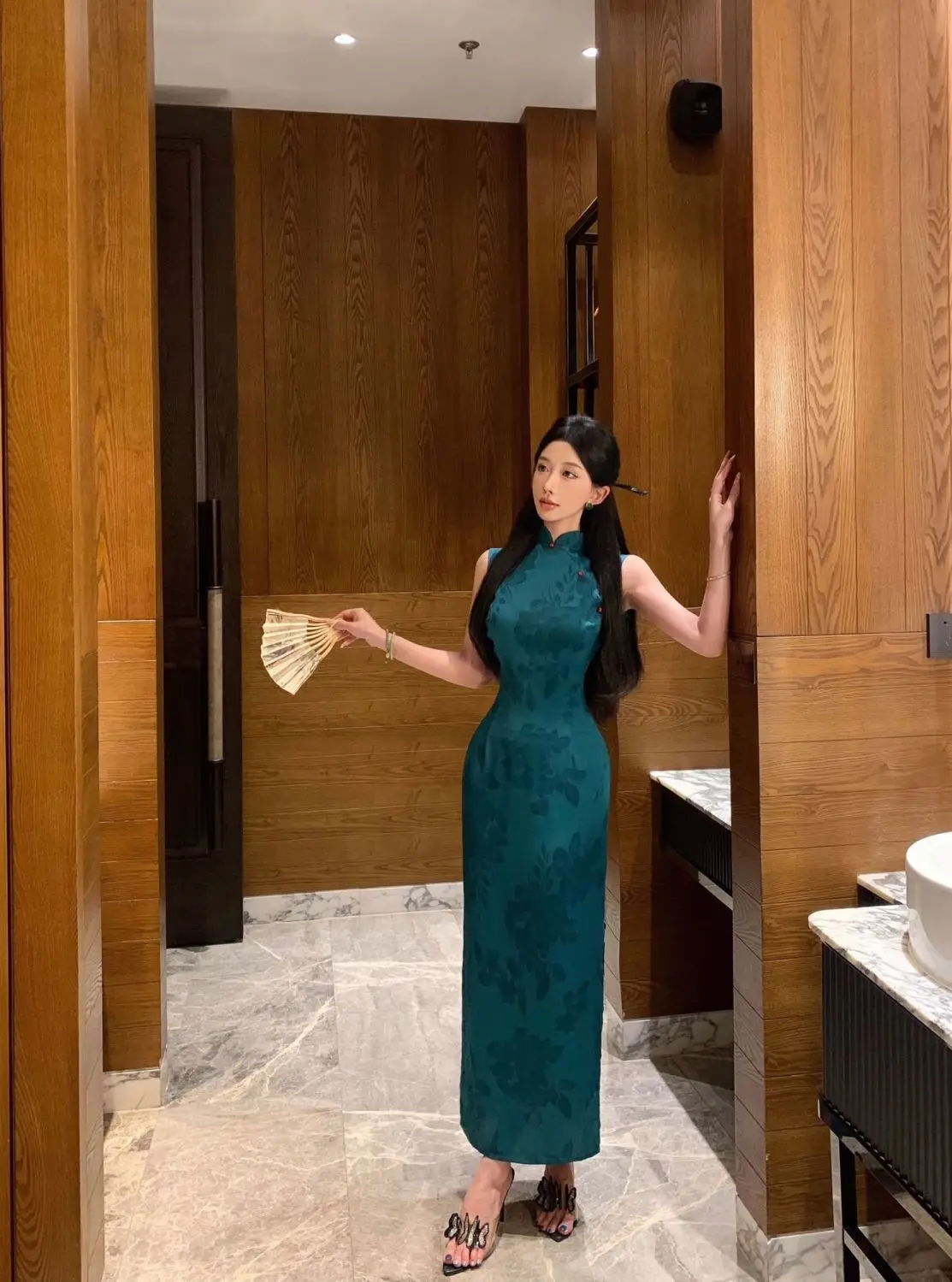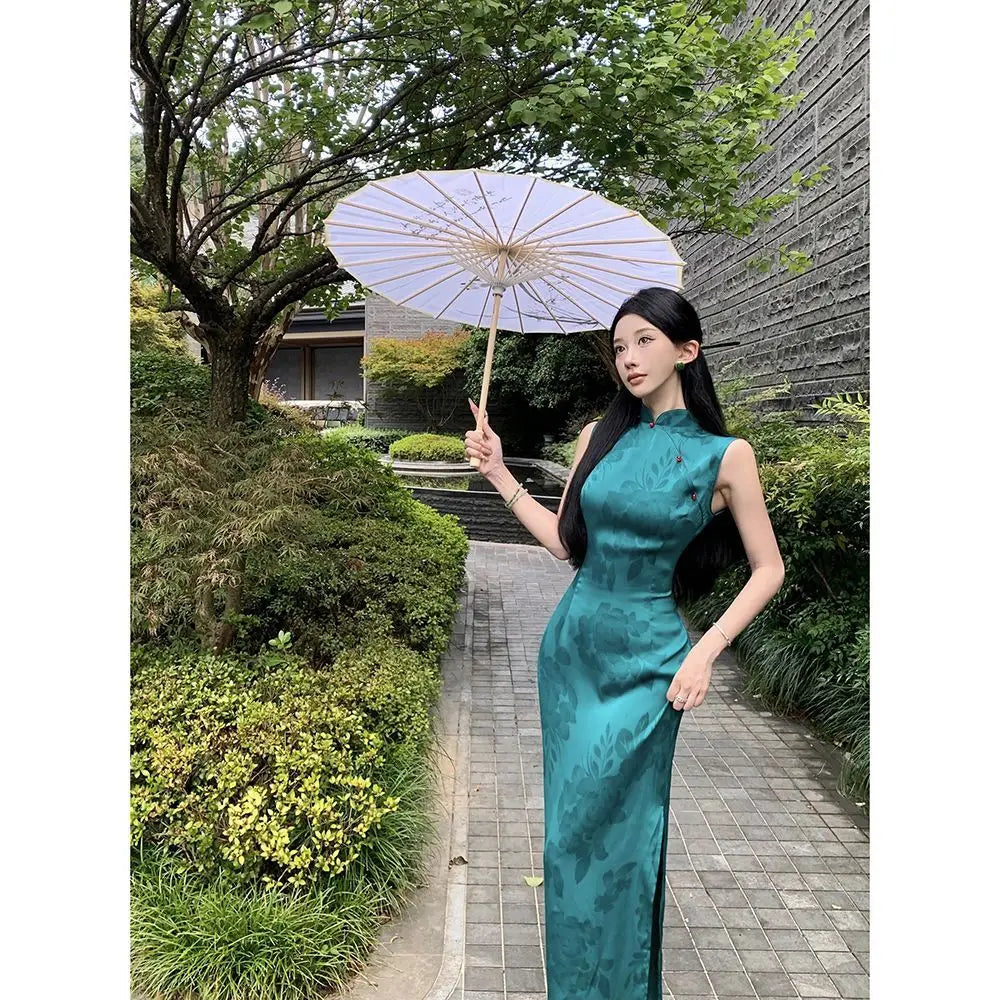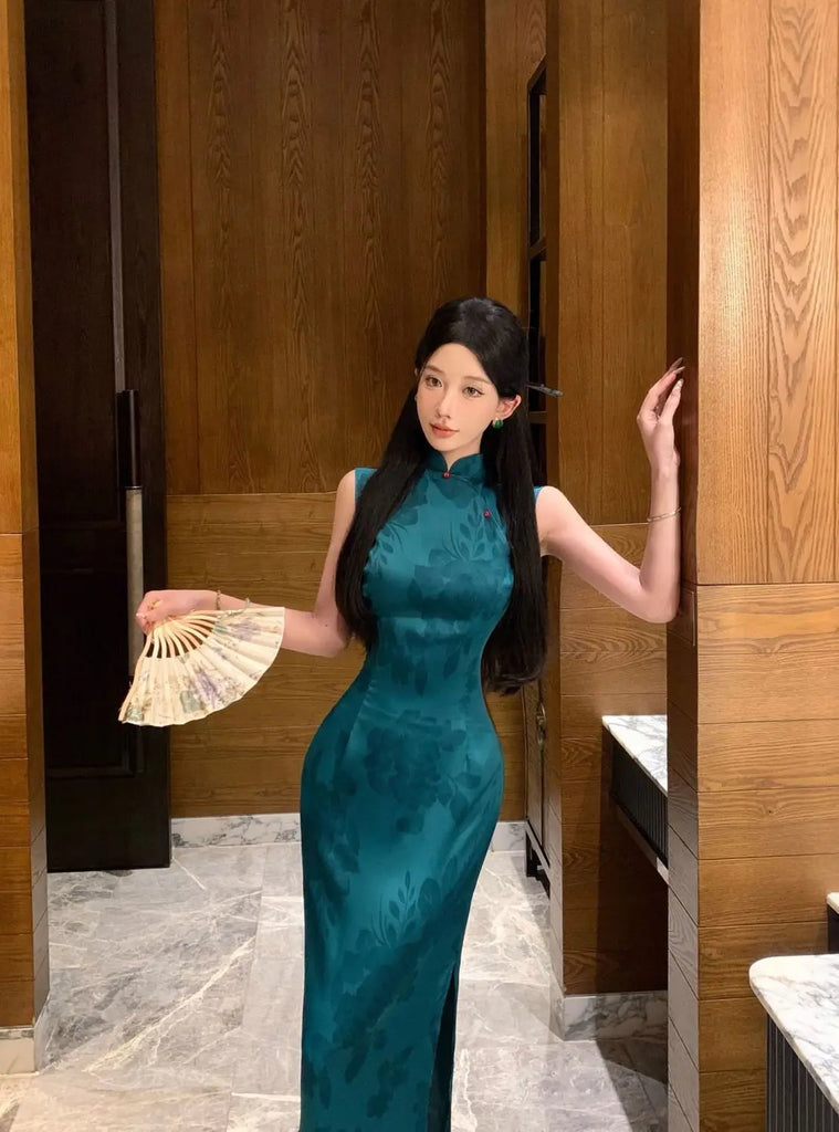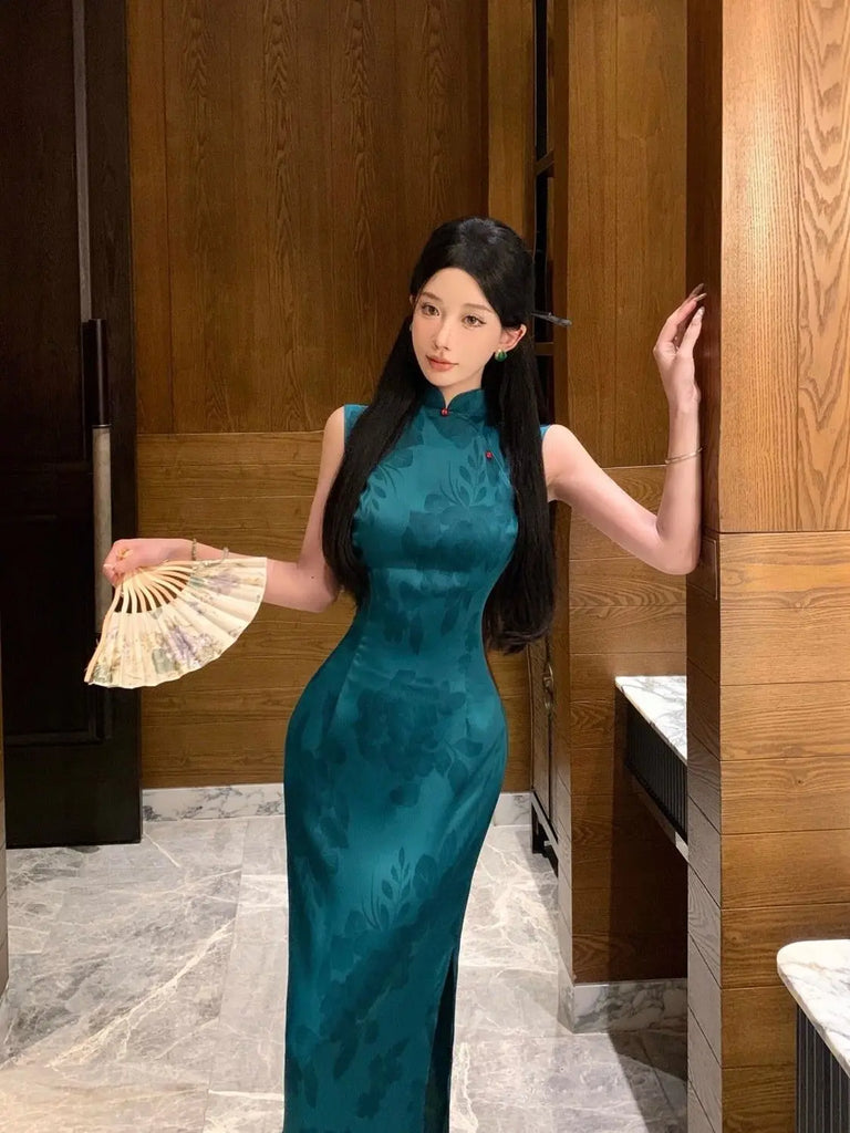 Purpdrank Vintage Peacock Blue Green Sleeveless Dress Qipao New Chinese Style Printed Long Elegant Floral Print Cheongsam Slim Morden