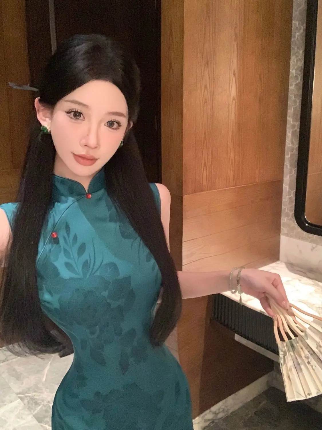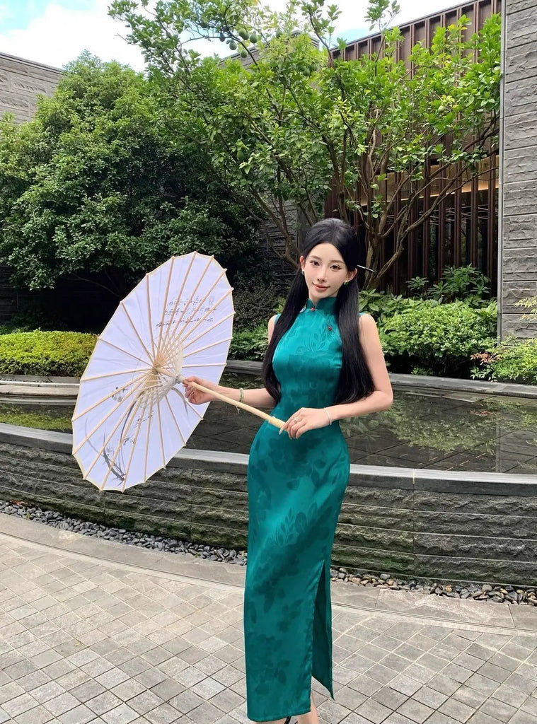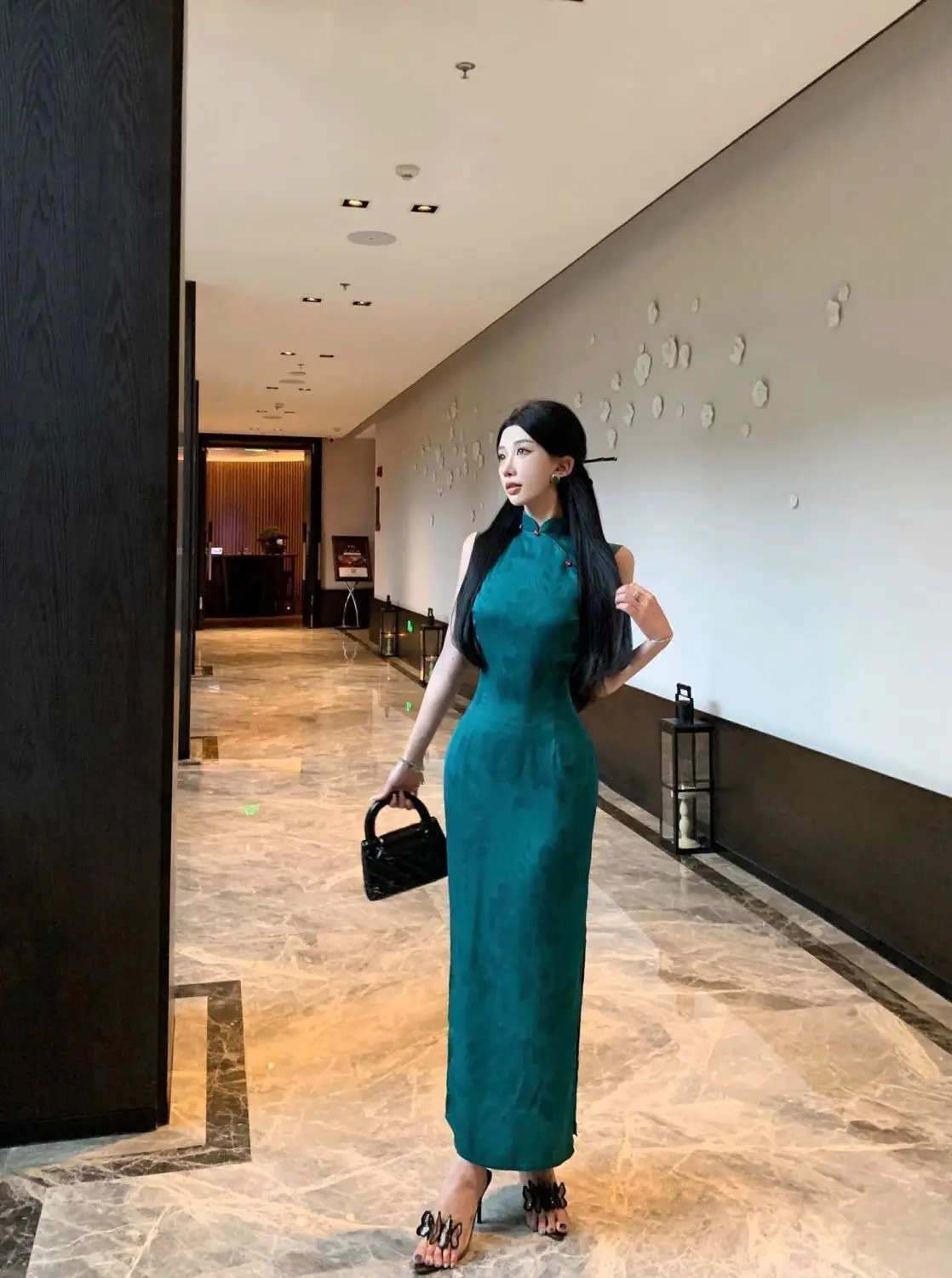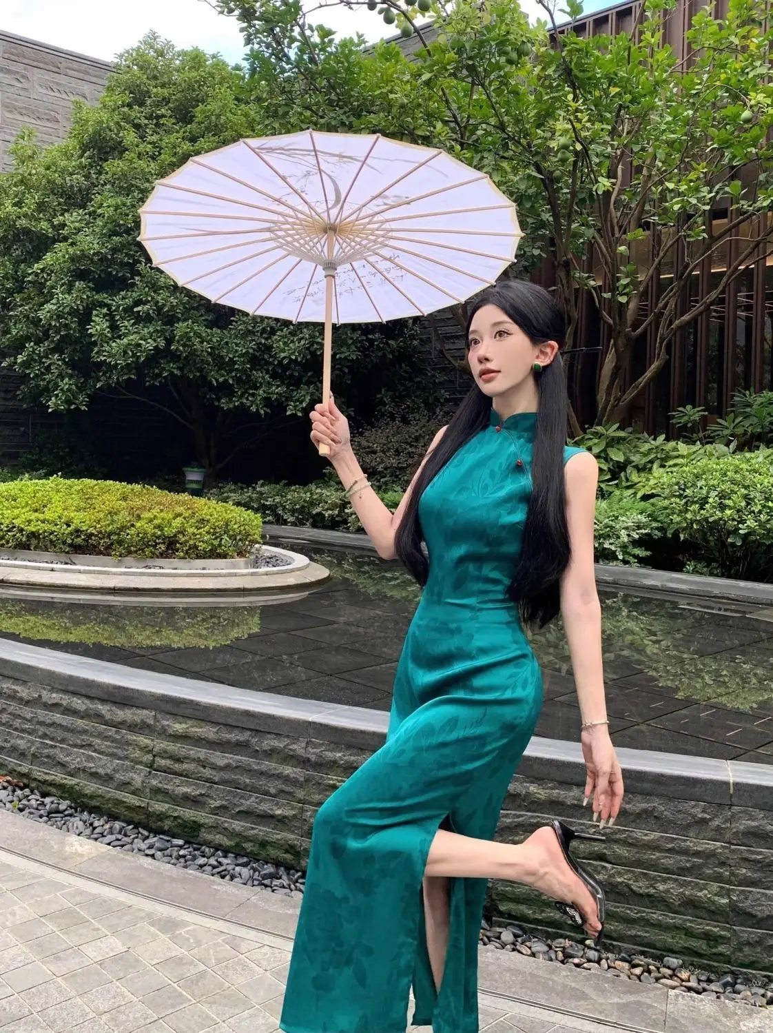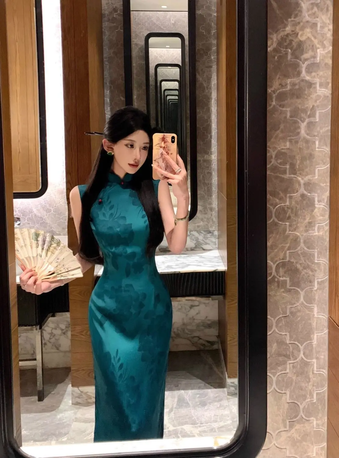 Purpdrank Vintage Peacock Blue Green Sleeveless Dress Qipao New Chinese Style Printed Long Elegant Floral Print Cheongsam Slim Morden