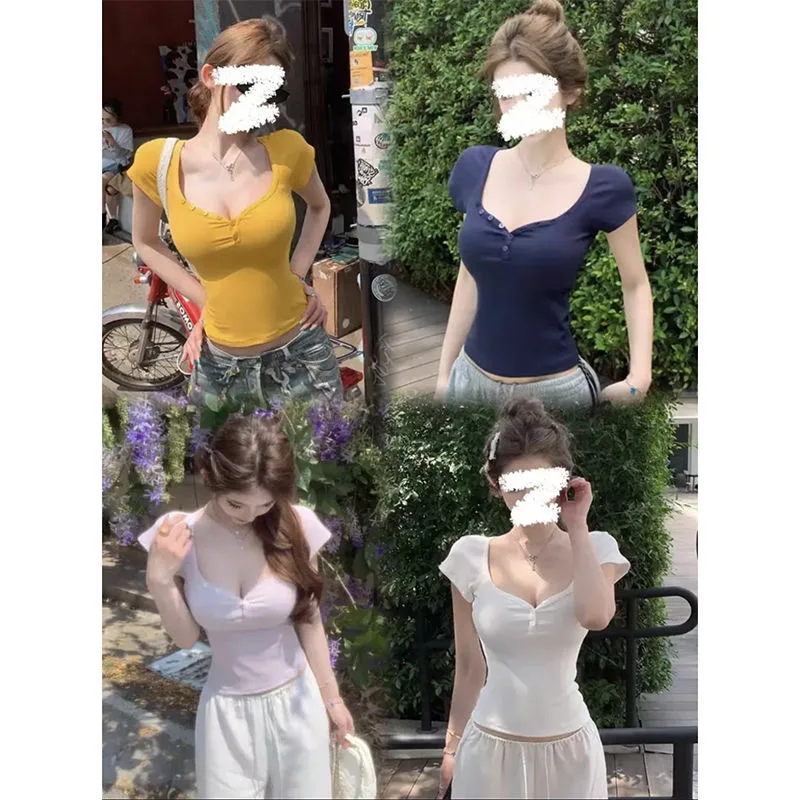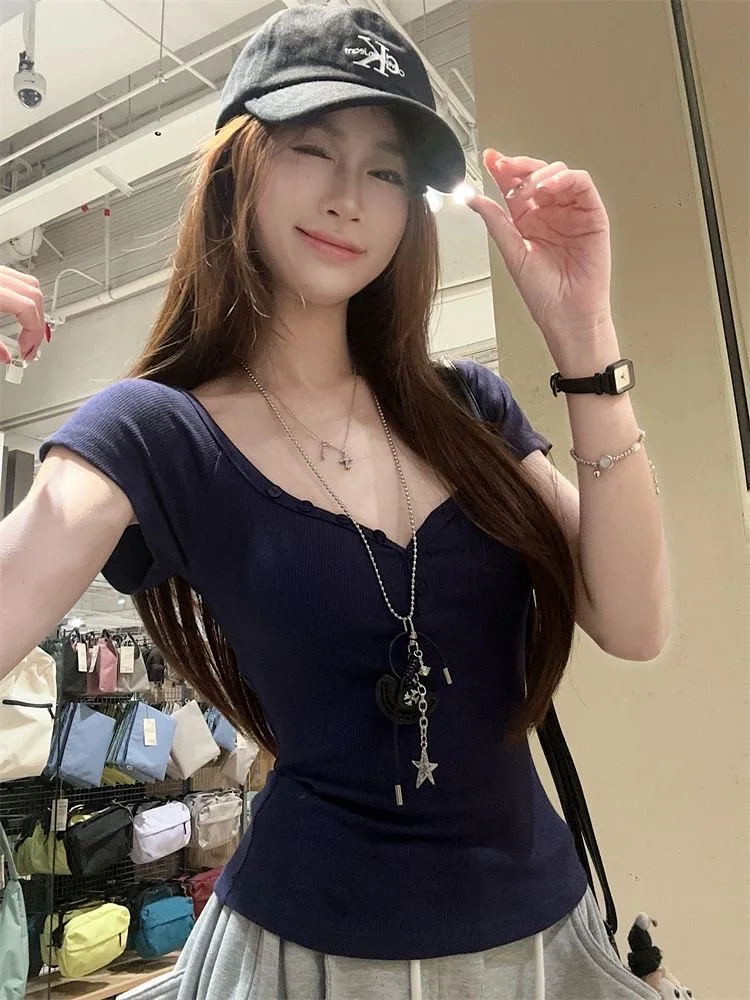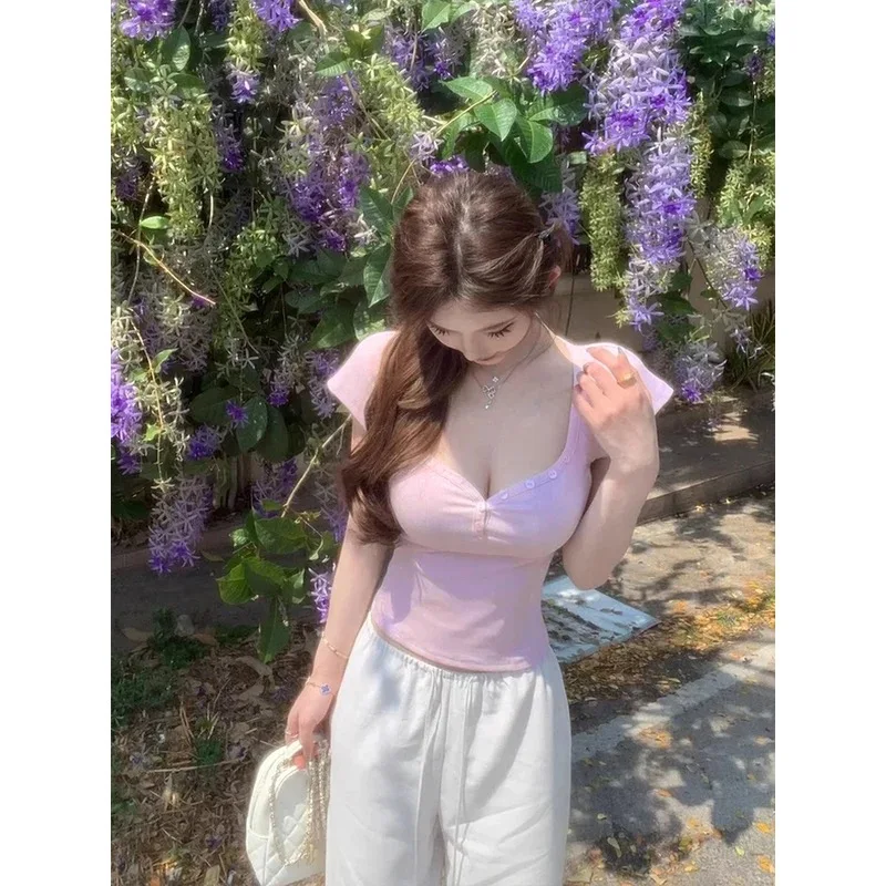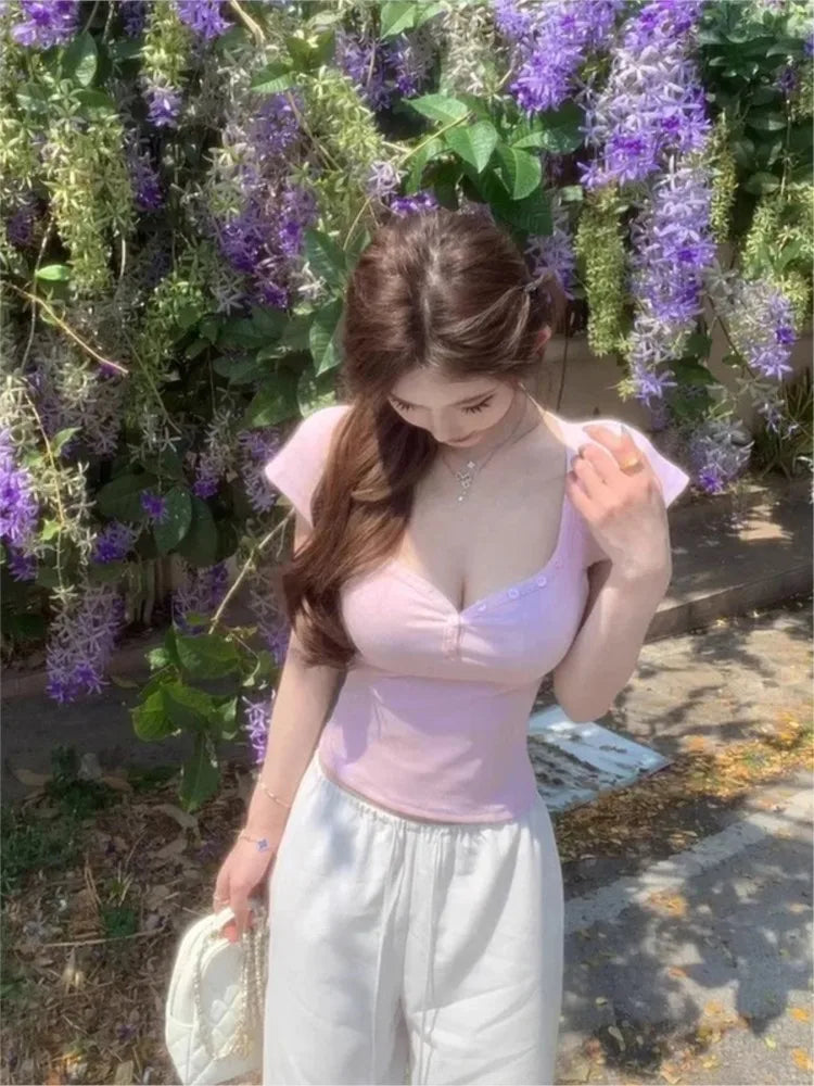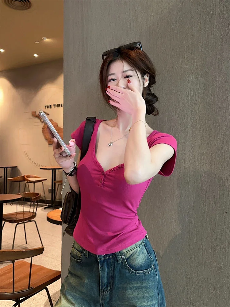 Purpdrank Vintage Street Y2K Button Up V-Neck Crop Top Women Sexy Low-Cut Skinny Cropped T Shirts Woman Summer Basic Short Sleeve Tee