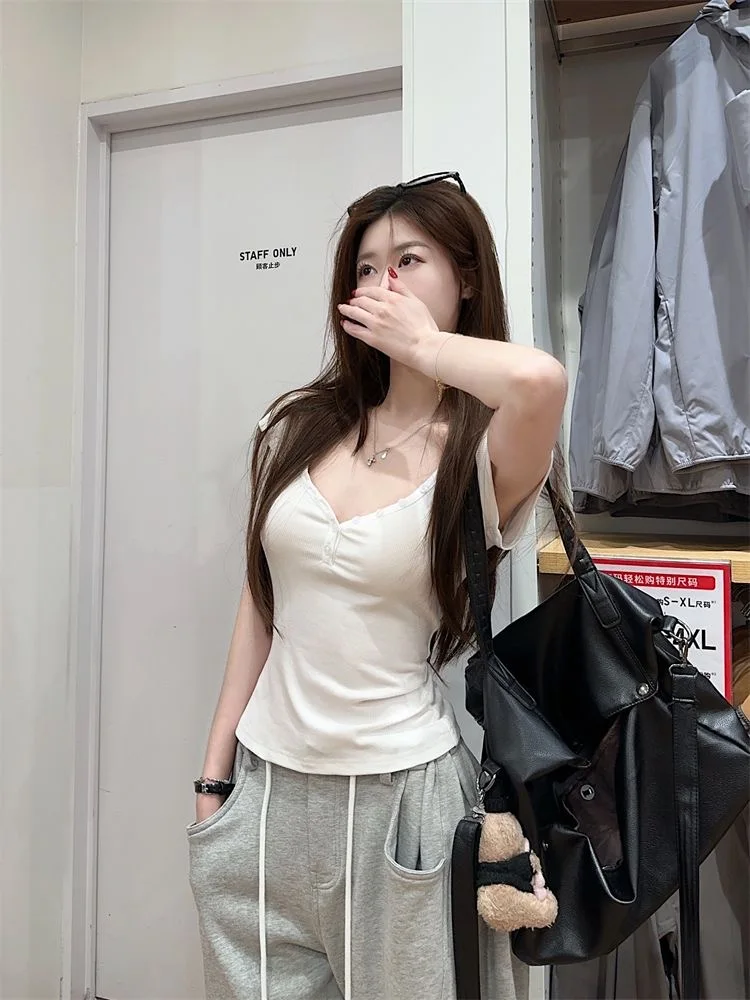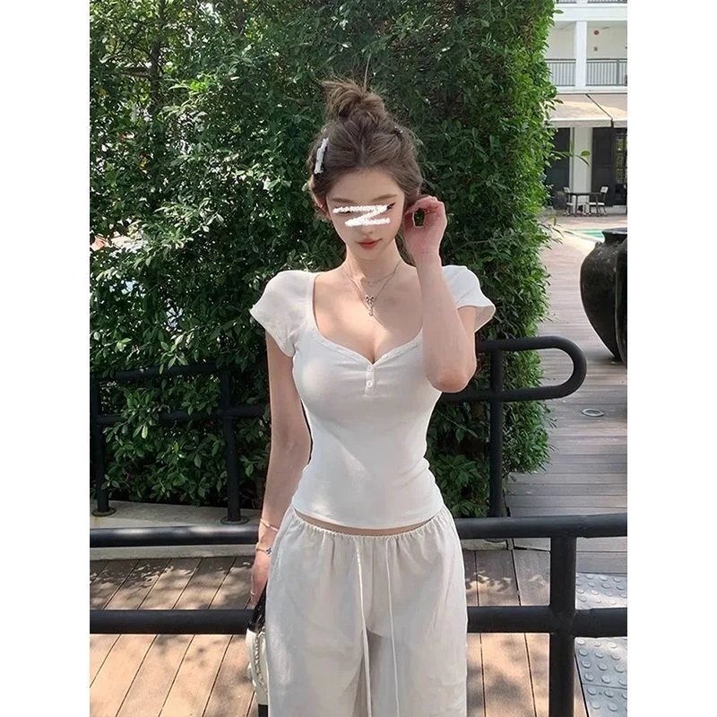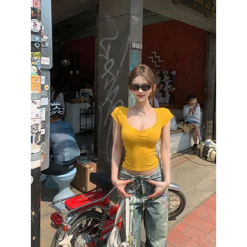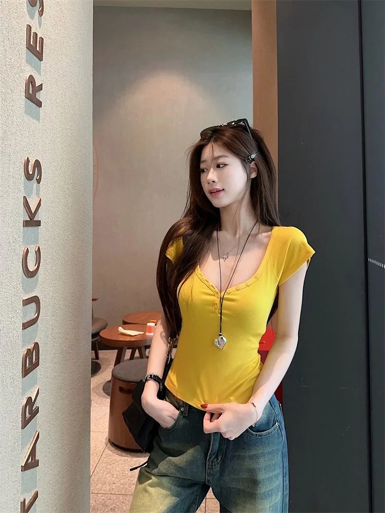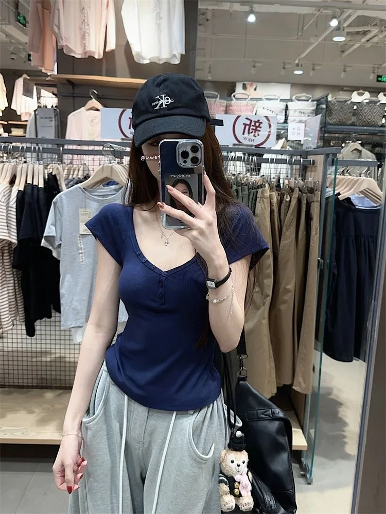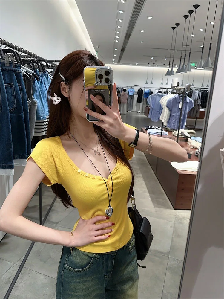 Purpdrank Vintage Street Y2K Button Up V-Neck Crop Top Women Sexy Low-Cut Skinny Cropped T Shirts Woman Summer Basic Short Sleeve Tee