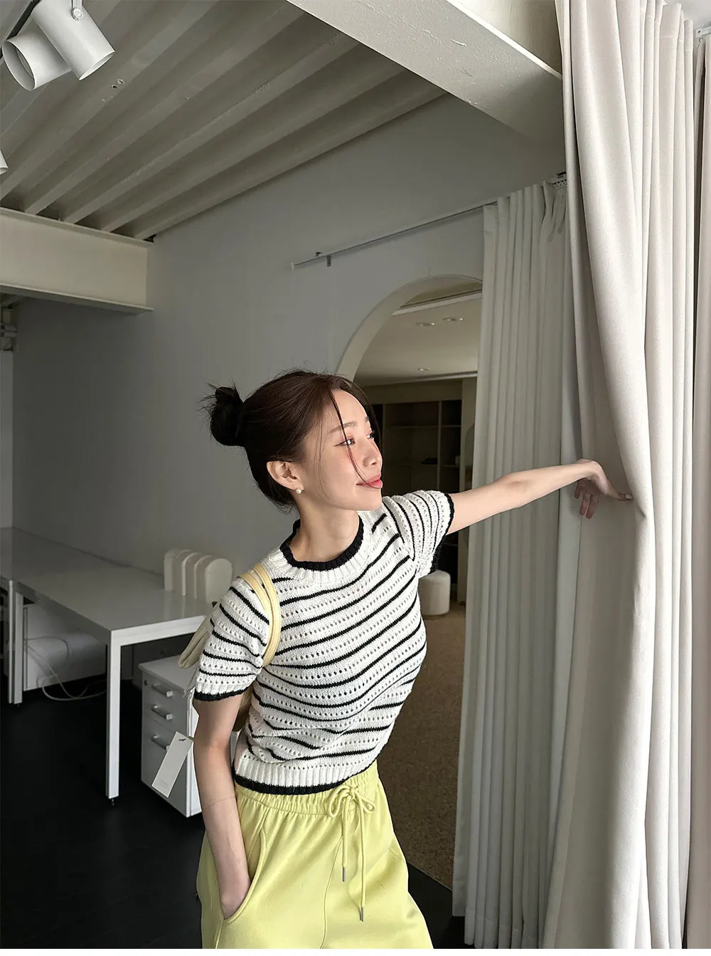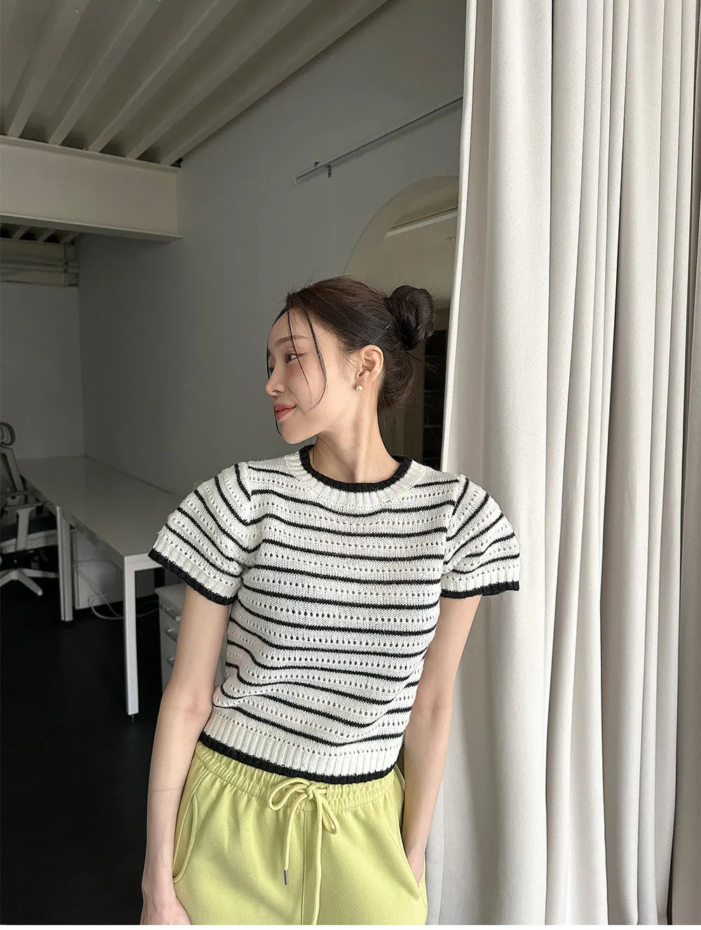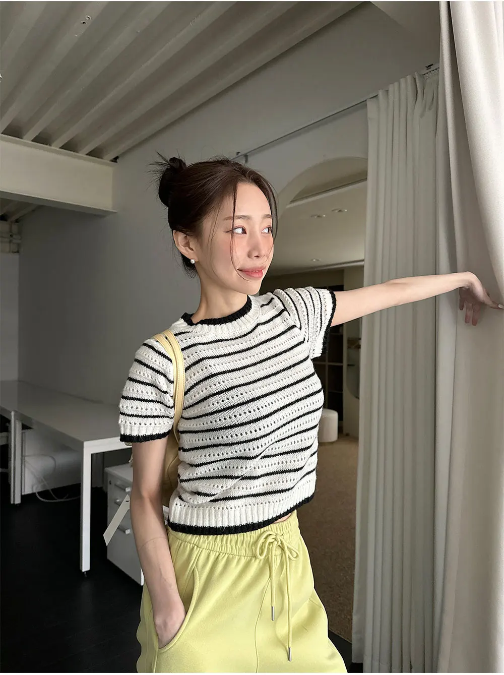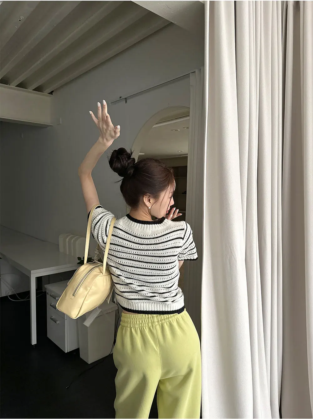 Purpdrank Vintage Striped Women's Knitted T-shirts 2025 New Summer Casual Loose O-neck Hollow Out Knitwear Short Shirts Top Female