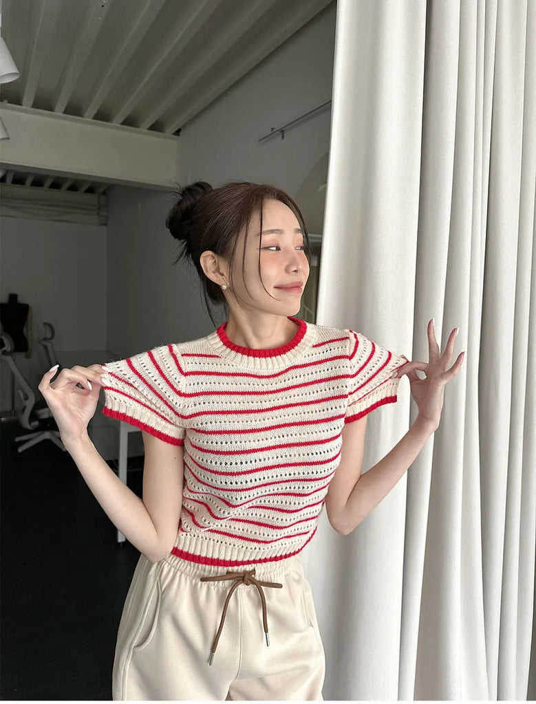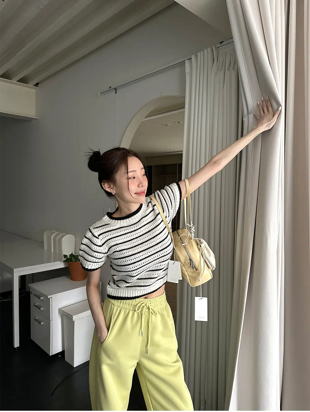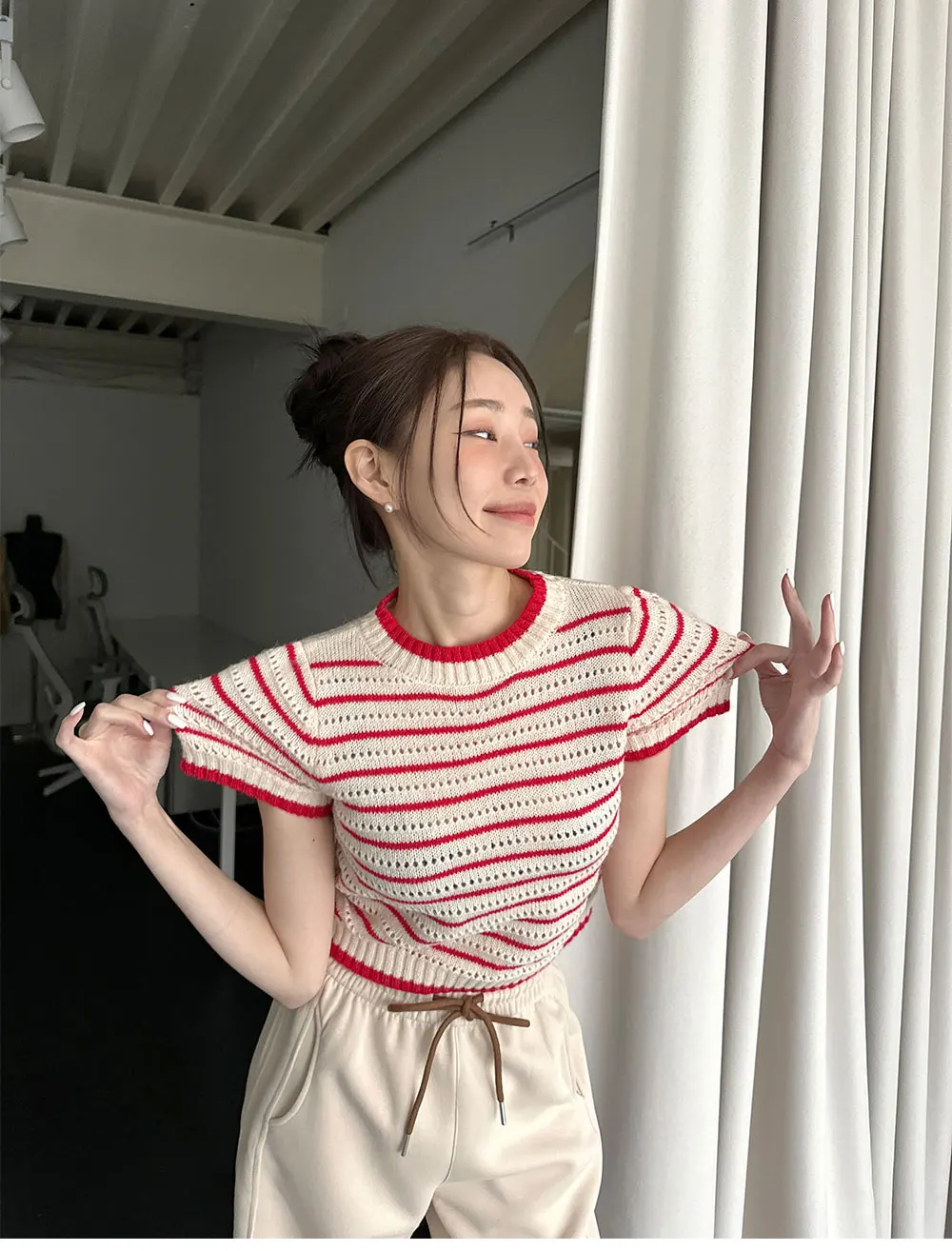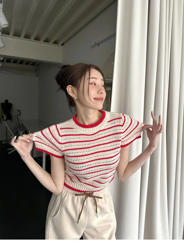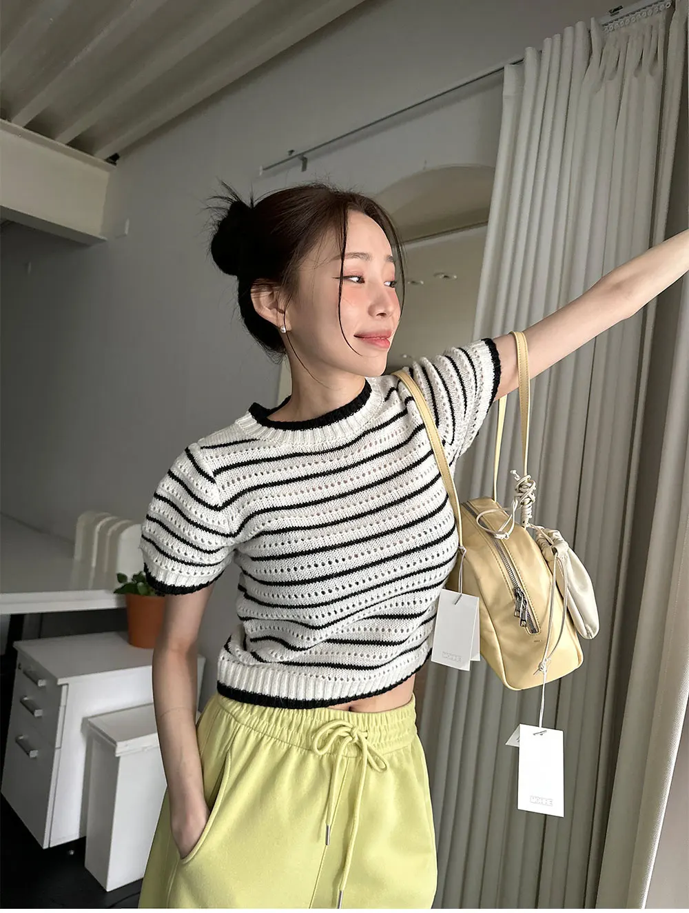 Purpdrank Vintage Striped Women's Knitted T-shirts 2025 New Summer Casual Loose O-neck Hollow Out Knitwear Short Shirts Top Female