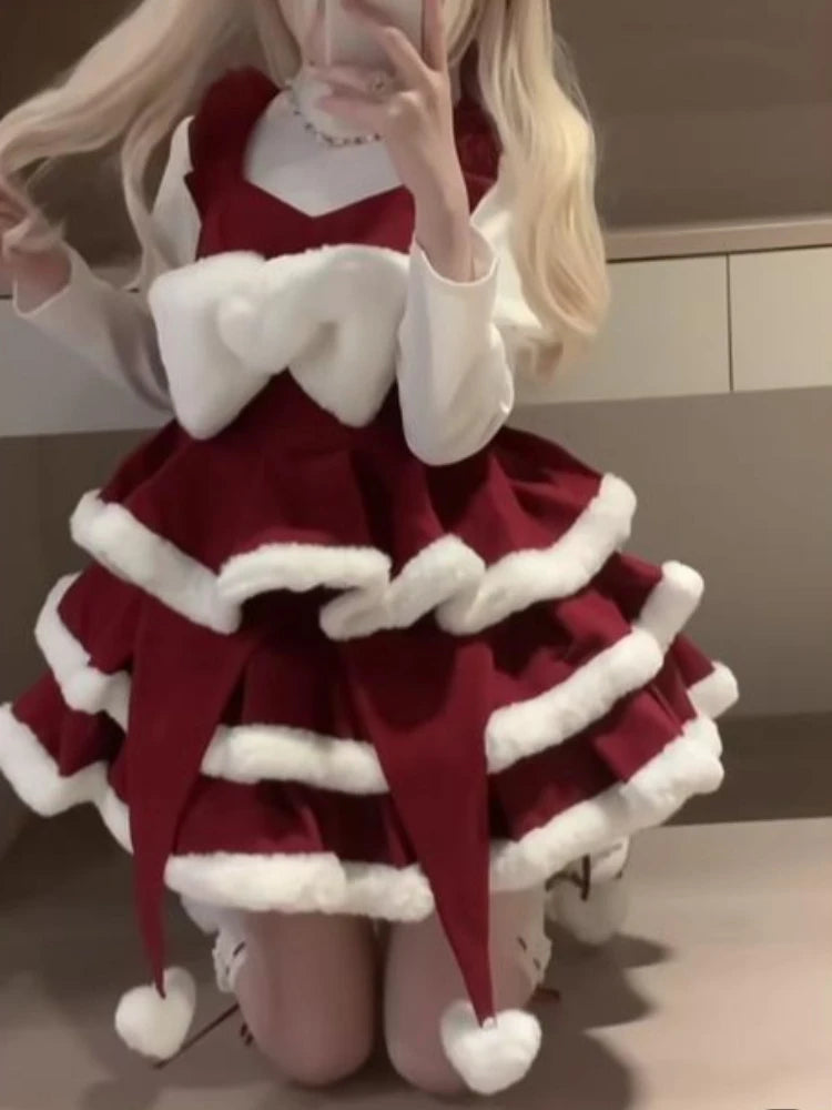 Purpdrank Winter Christmas Sweet Lolita 2 Piece Sets Fit Chic Blouses + Fuzzy Fluffy Dresses New Kawaii Slim Fashion Warm Cute Outfit