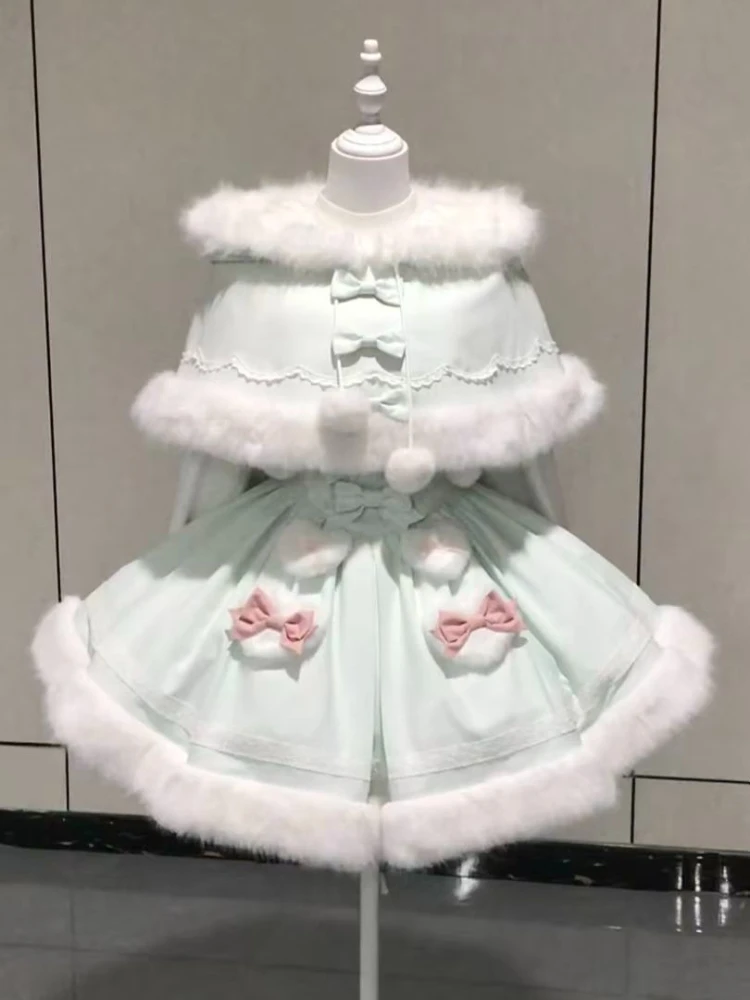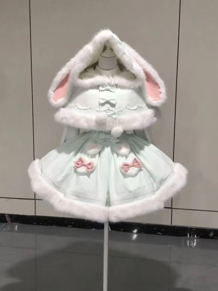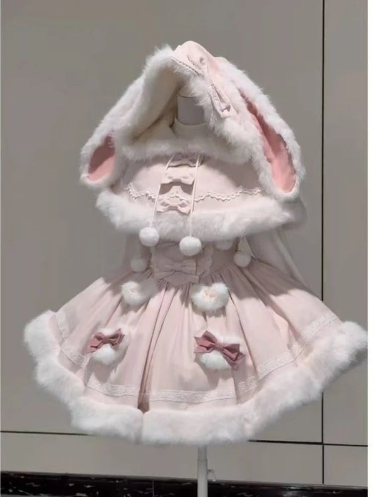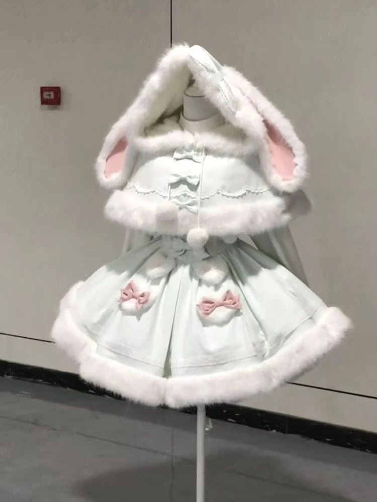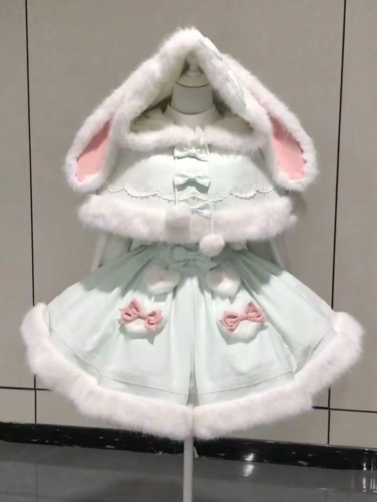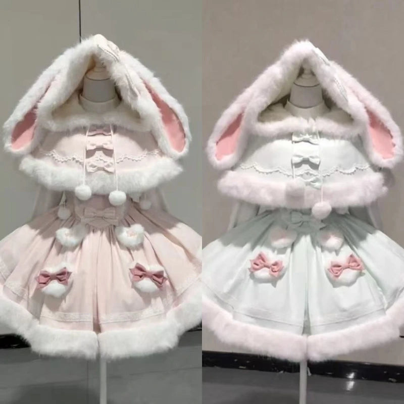 Purpdrank Winter Sweet Kawaii Elegant 2 Piece Set Women Design Rabbit Ear Cloak Coat +Chic Strap Skirts Female Princess Retro Outfits