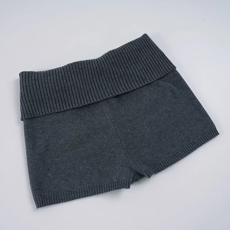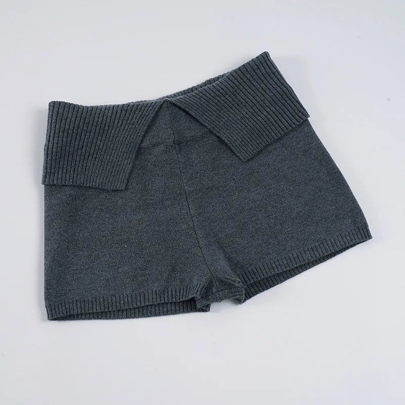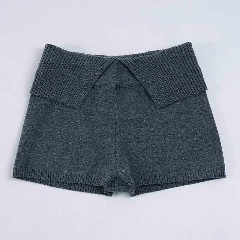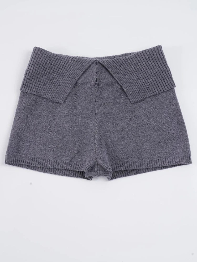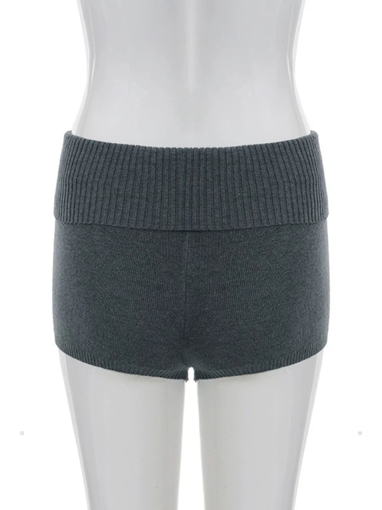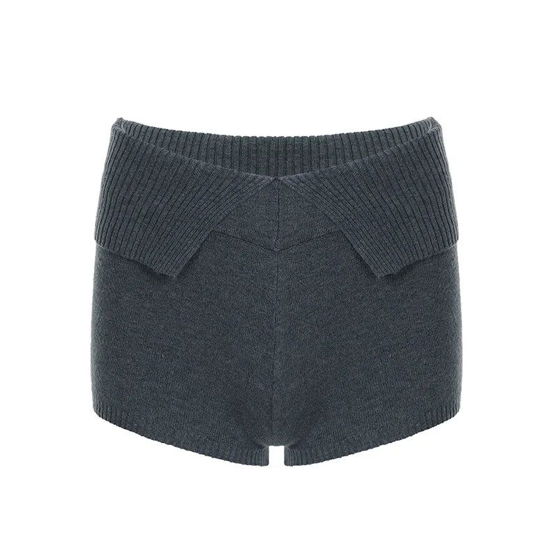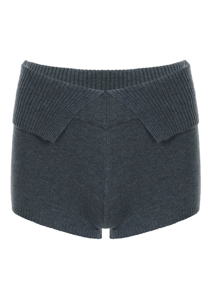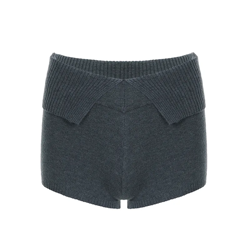 Purpdrank Women Casual Gray Knit Shorts American Retro Style Folded Slit Elastic Waist Slim Pure Color Stretch Shorts for Home Wear