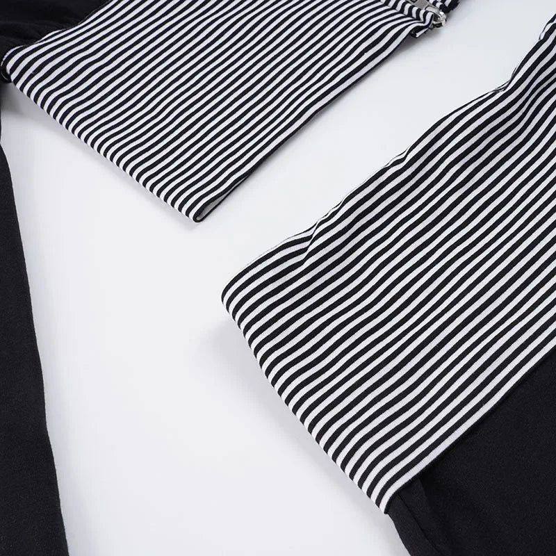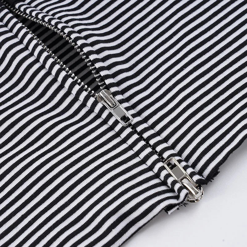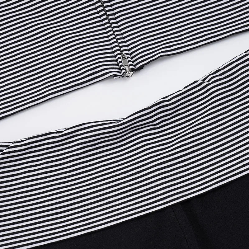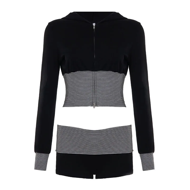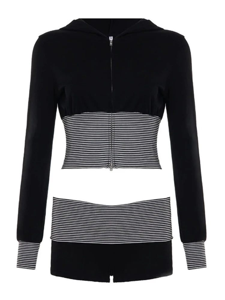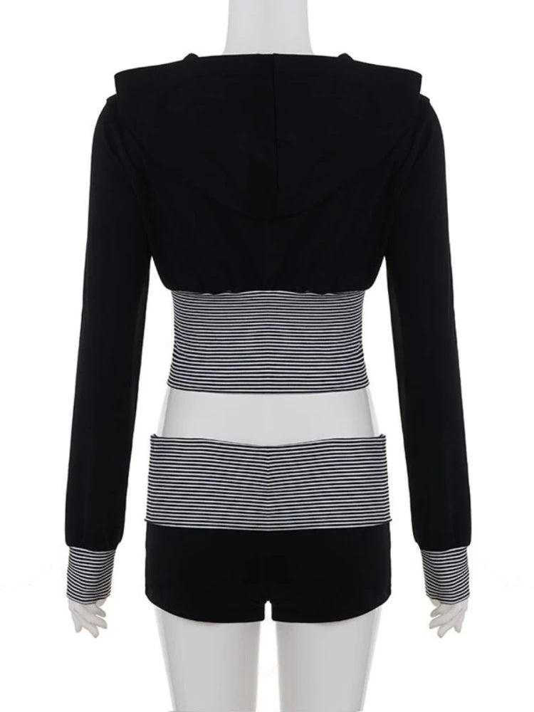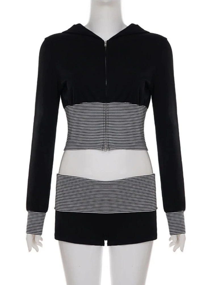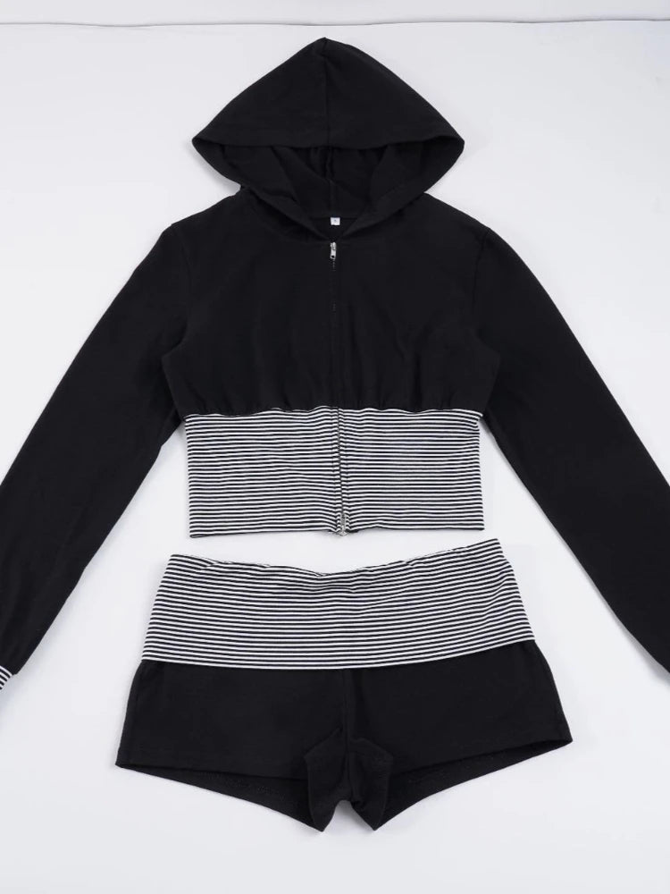 Purpdrank Women Casual Striped Color Block 2-Piece Set Zip Up Long Sleeve Crop Hoodie & Shorts Matching Suits Streetwear Tracksuit