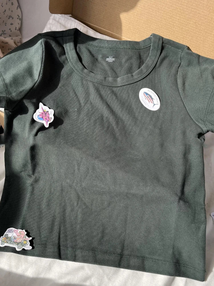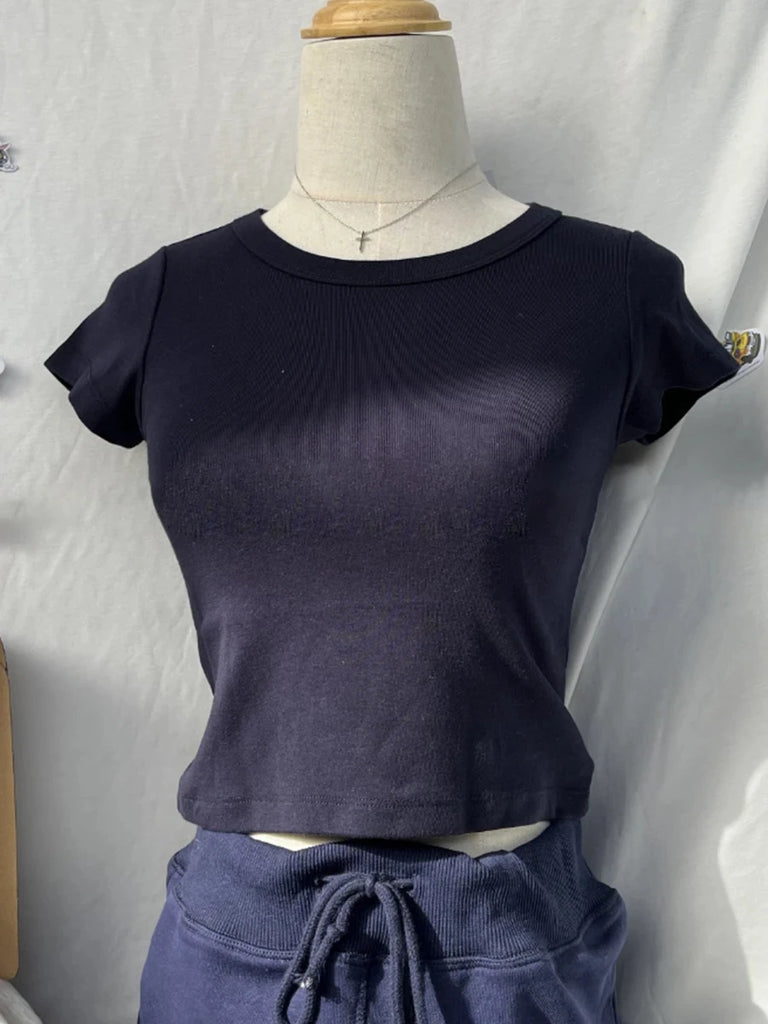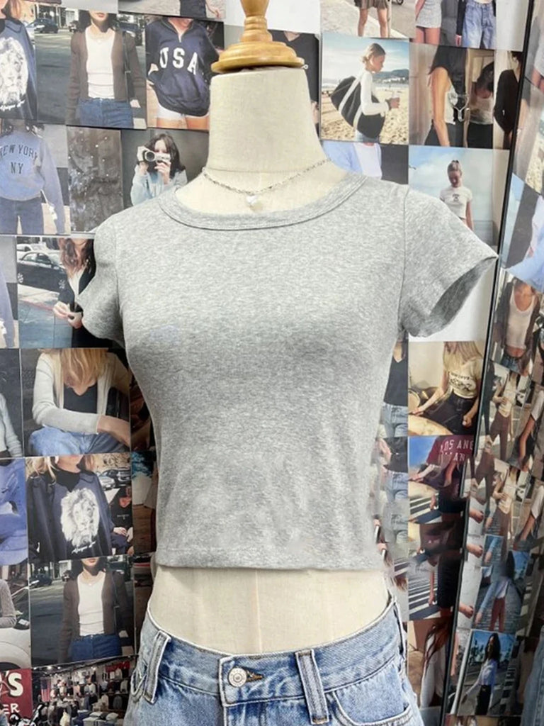 Purpdrank Women Solid Vintage Slim T-shirts Cute Sweet Round Neck Short Sleeve Cotton Y2k Crop Top Harajuku Summer Basic Casual Tees Tops