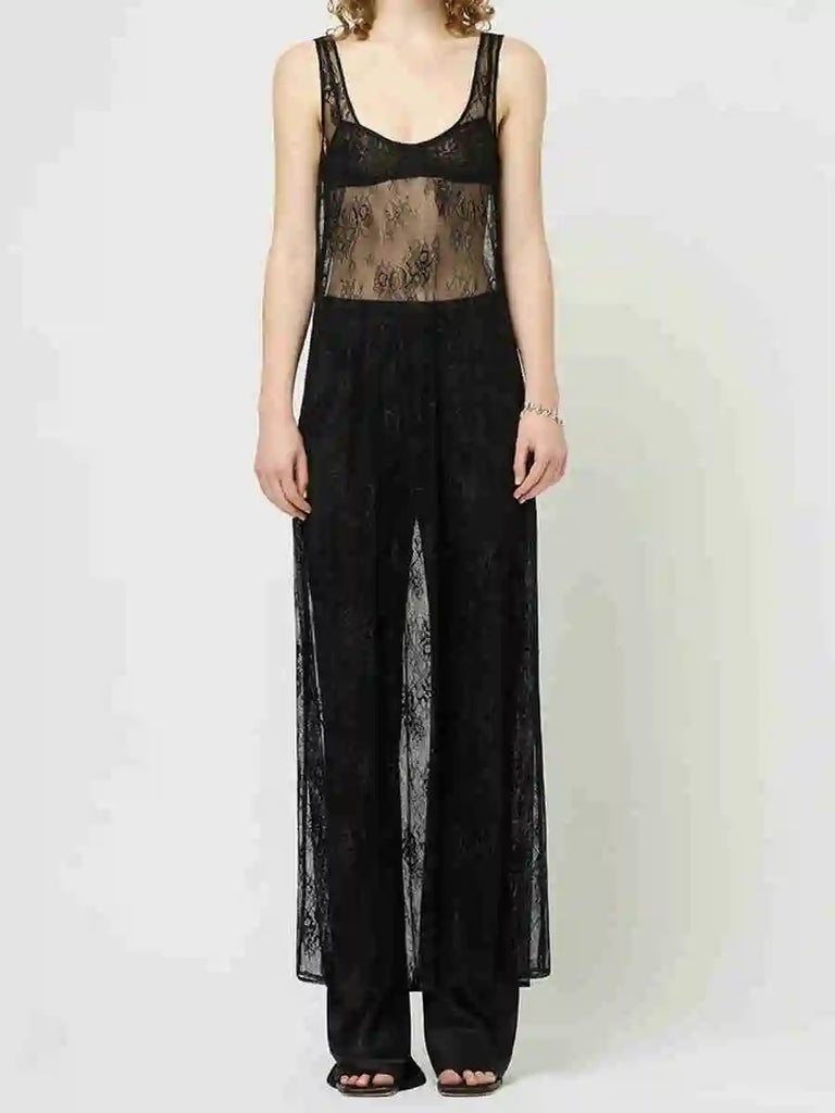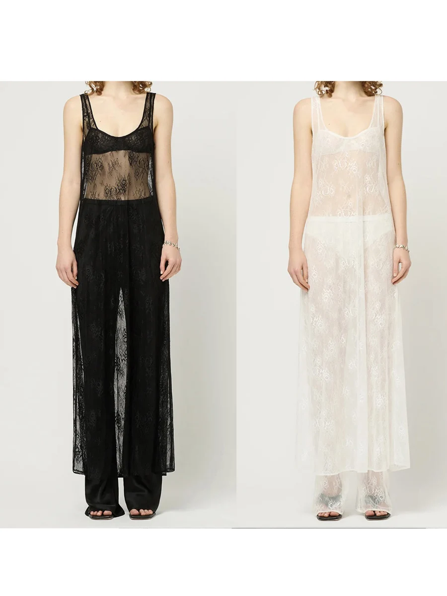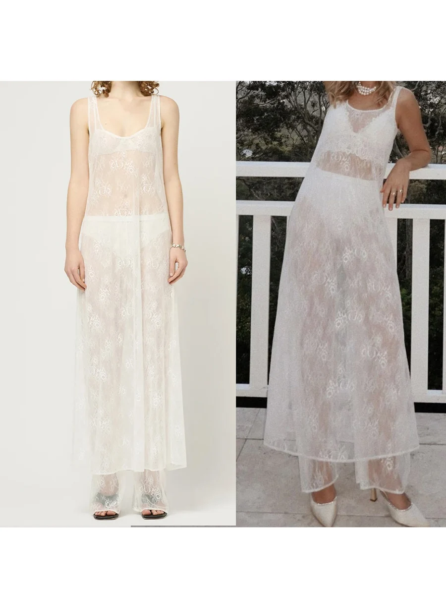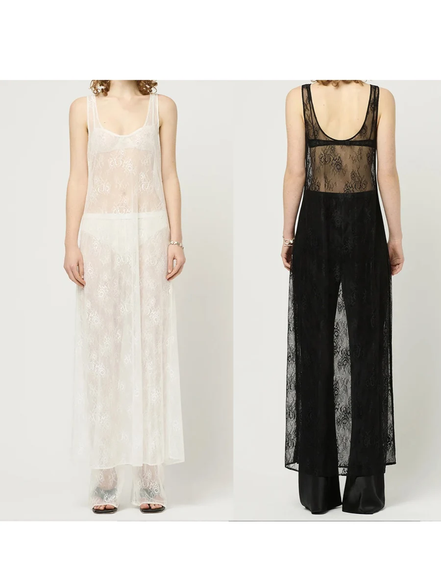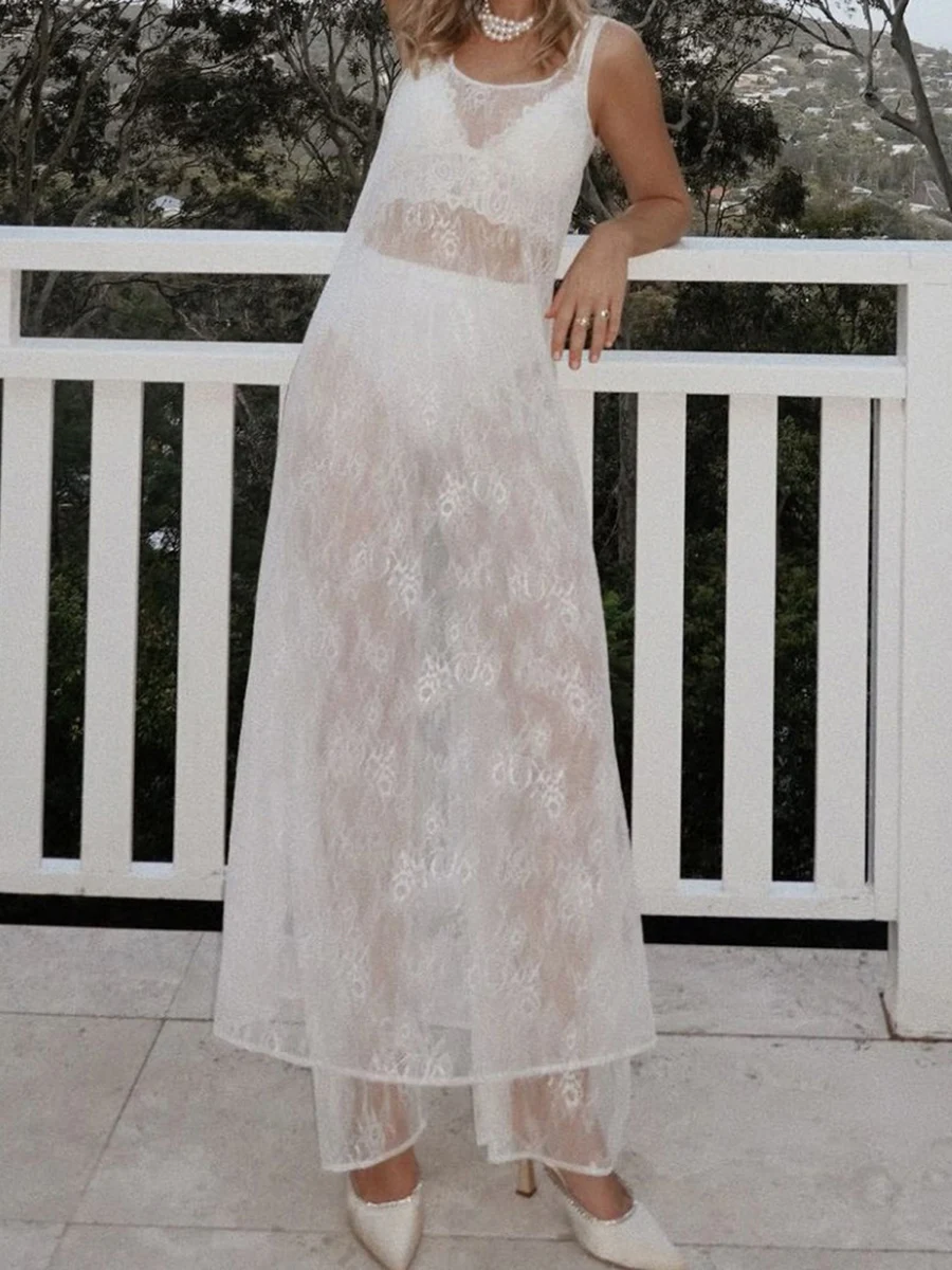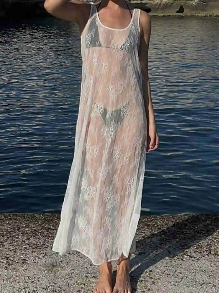 Purpdrank Women Summer Bikini Cover-Up Sleeveless U-Neck Lace Floral Mesh Sheer Loose Long Dress women