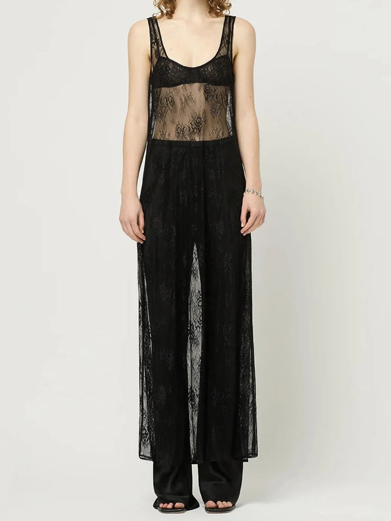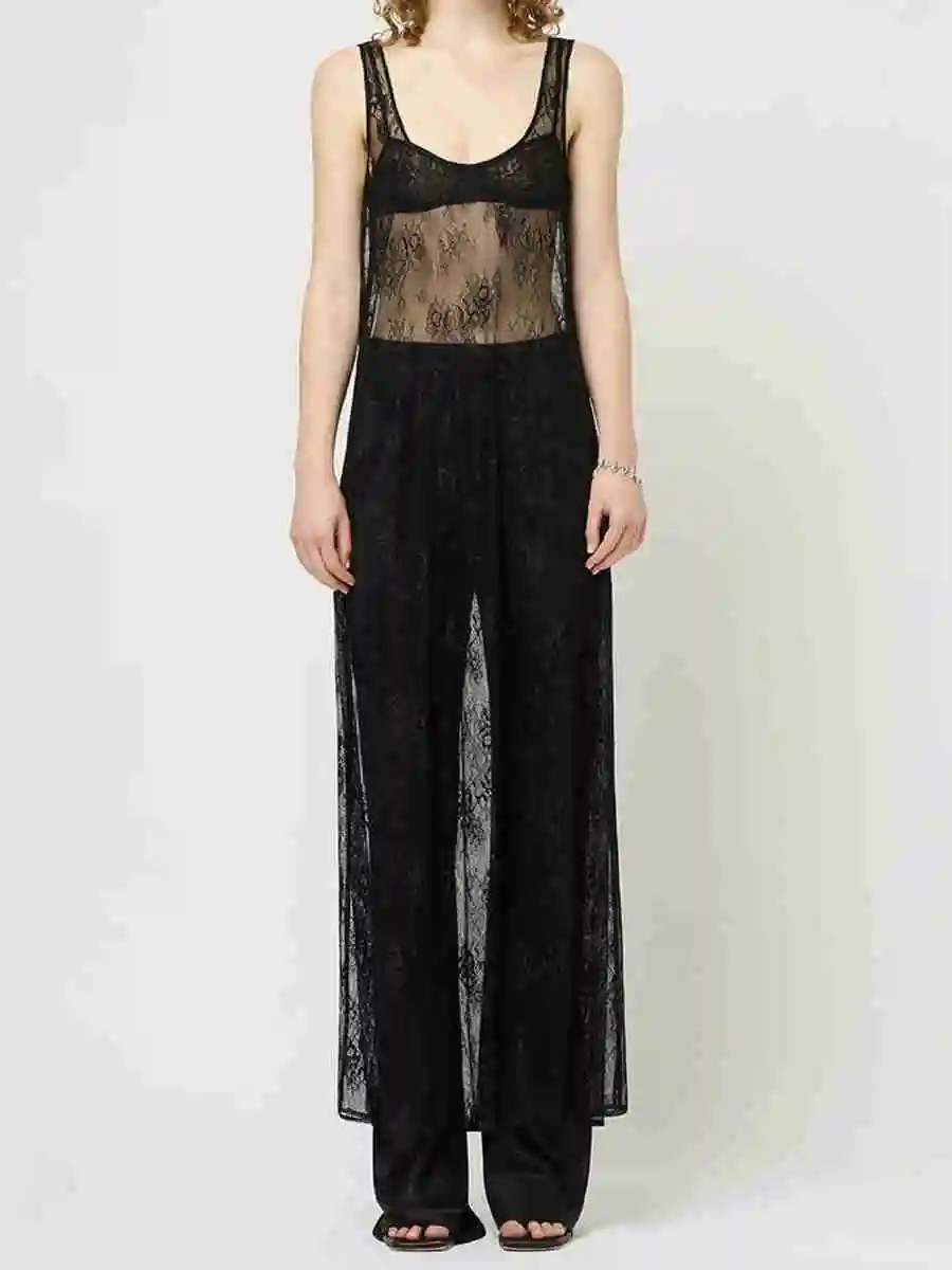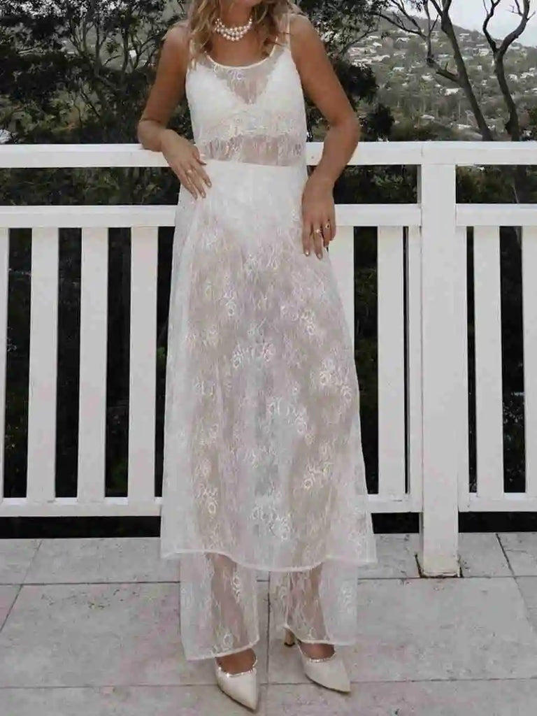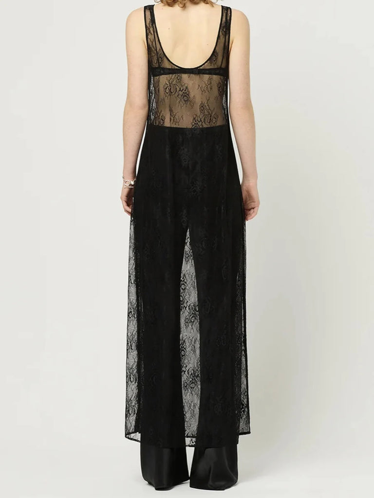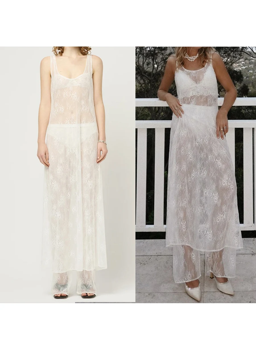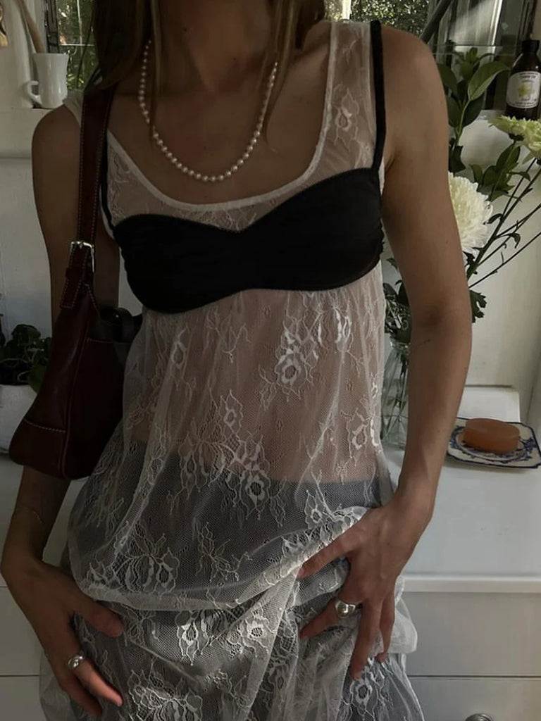 Purpdrank Women Summer Bikini Cover-Up Sleeveless U-Neck Lace Floral Mesh Sheer Loose Long Dress women