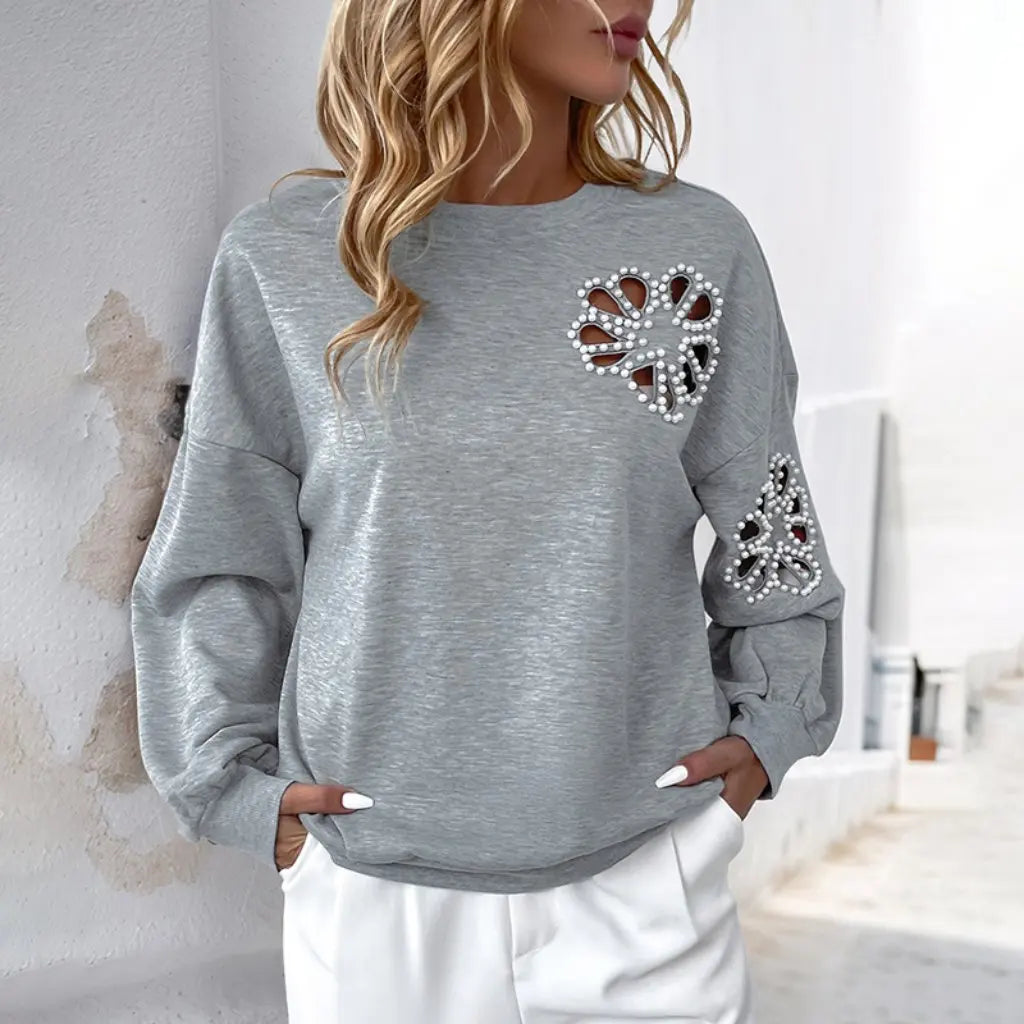 Purpdrank Women's round Neck Beaded Sweatshirt Casual Loose Cut out Pullover Top for Autumn And Winter European And American Style