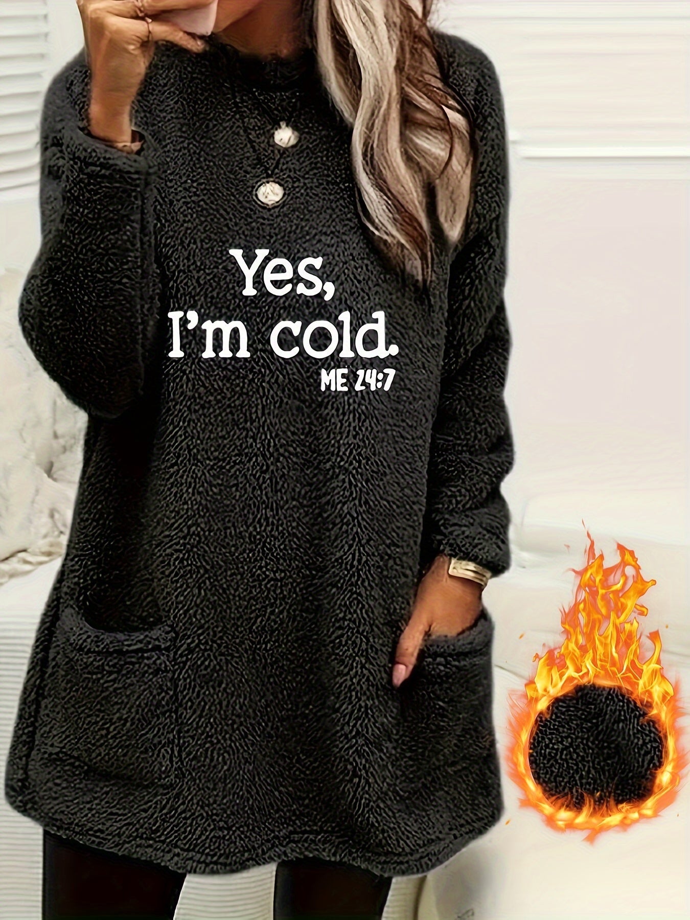 Purpdrank Yes I'm Cold Print Fleece Pullover Sweatshirt, Casual Long Sleeve Crew Neck Sweatshirt With Pockets For Fall & Winter, Women's Clothing