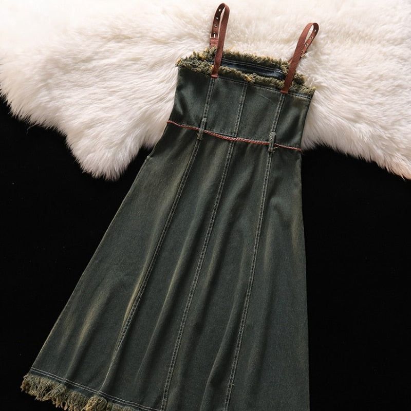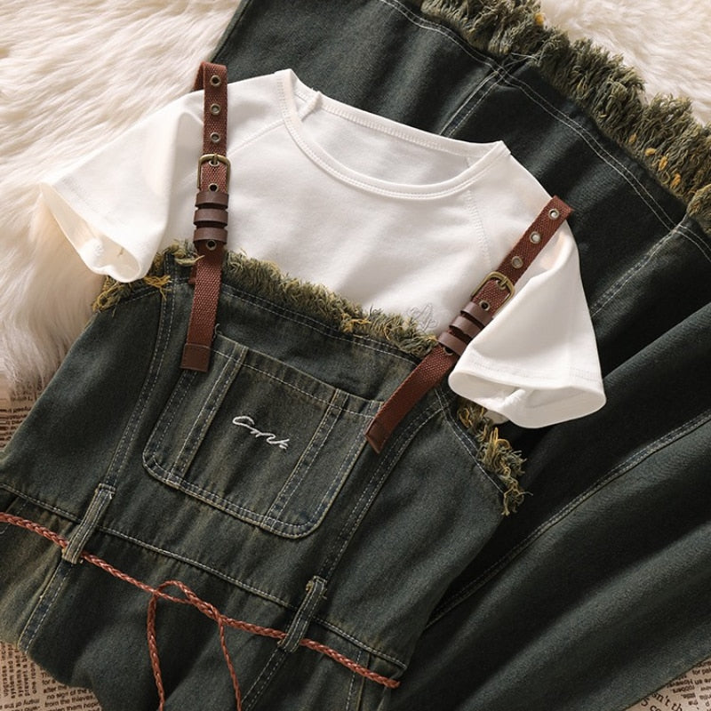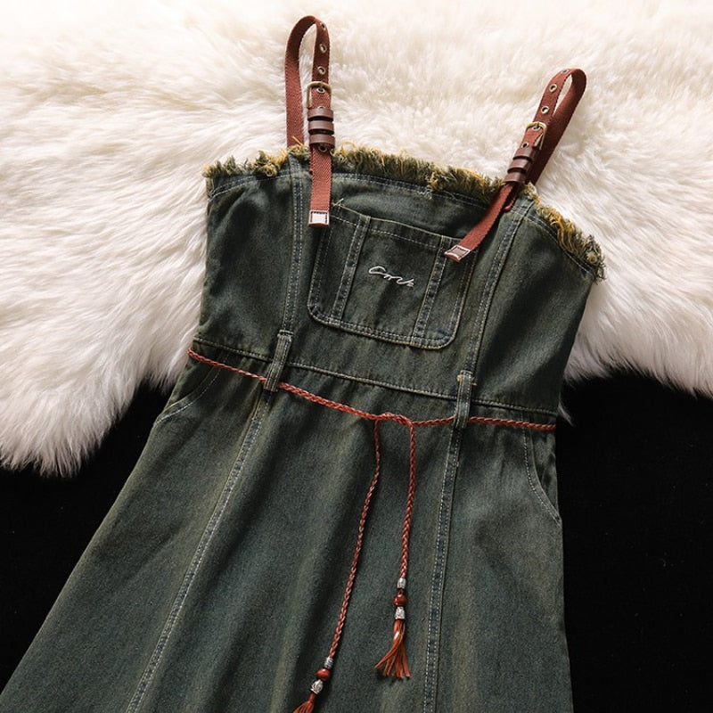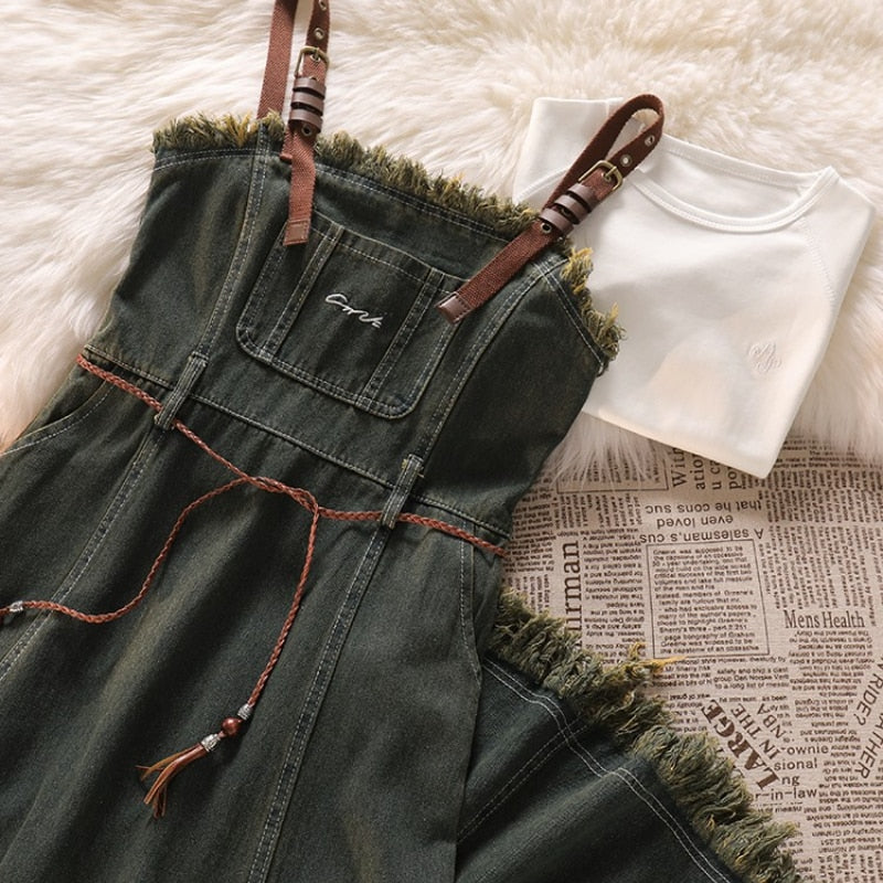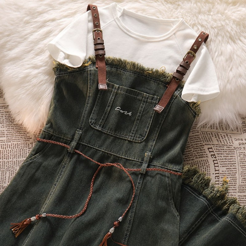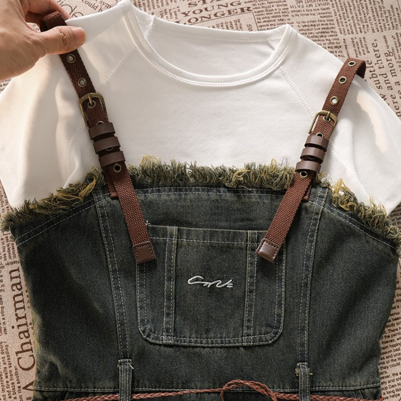 Purpdrank - Spicy Girl Short Cut Open Navel Short Sleeve T-shirt Women's Patchwork Tassel Denim Strap Dress High Street Set/single Pcs