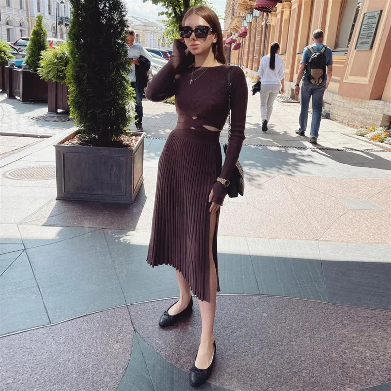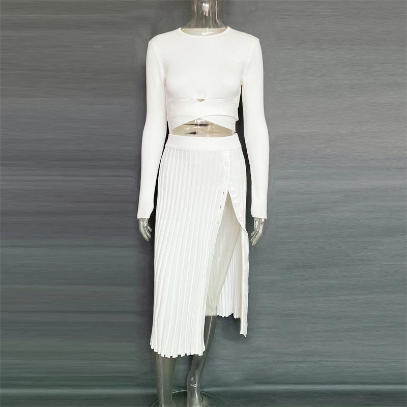 New White Knit Two Piece Women Sets Fall Ribbed Crop Top And Pleated Knitted Skirt Suits For Women Midi Dress Sets 2022
