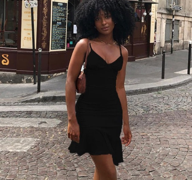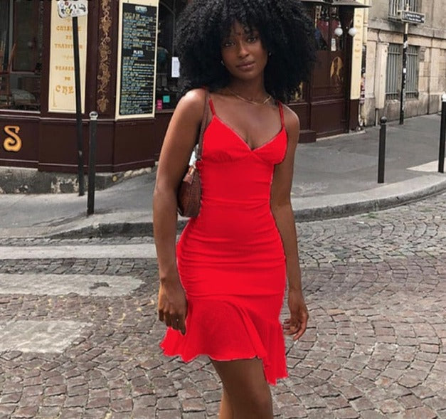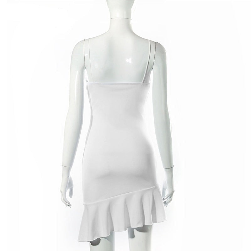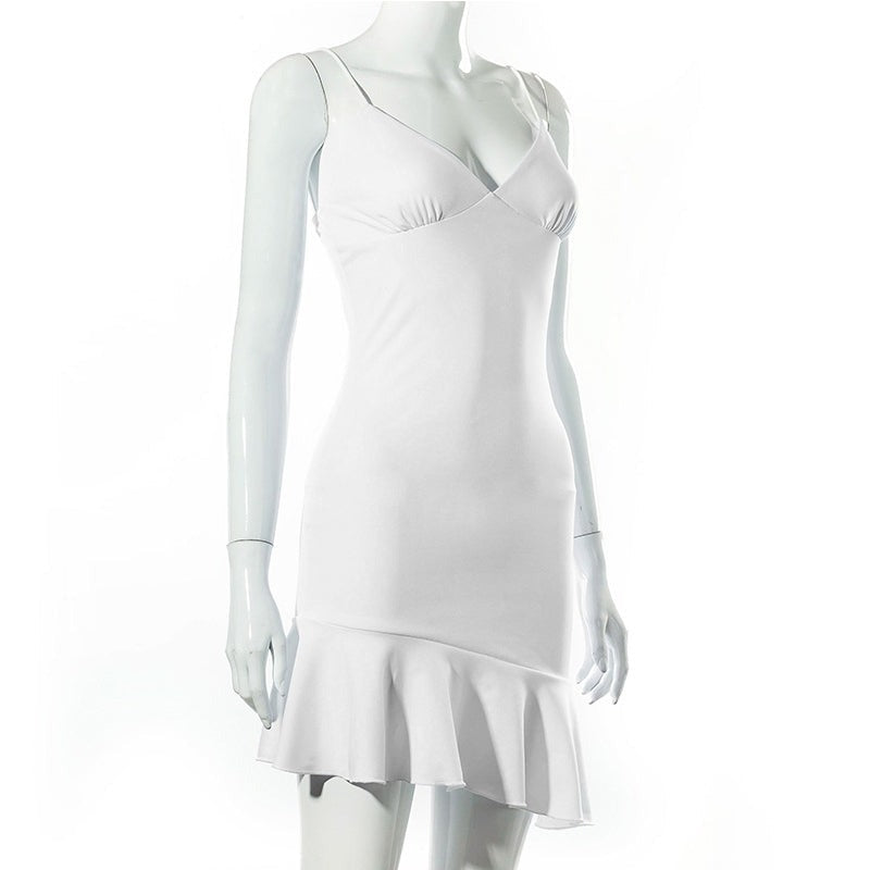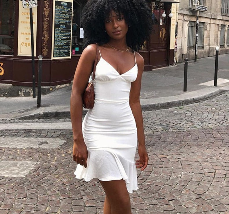Purpdrank - Elegant V Neck Ruffles Strap Sexy Bodycon Dress For Women 2023 Summer Sleeveless Office Lady Vintage Party White Dress