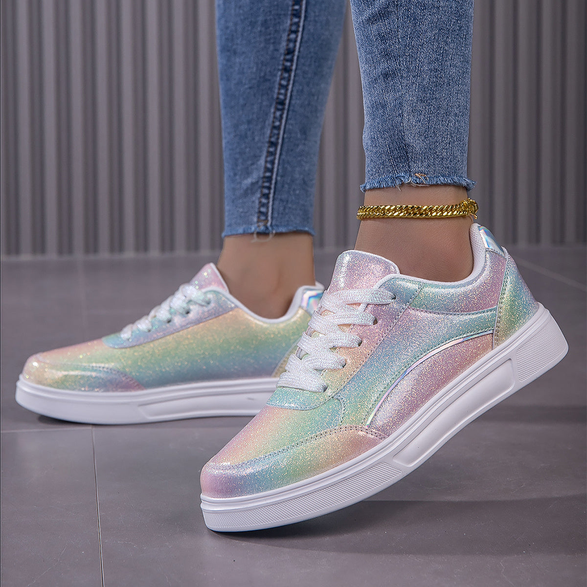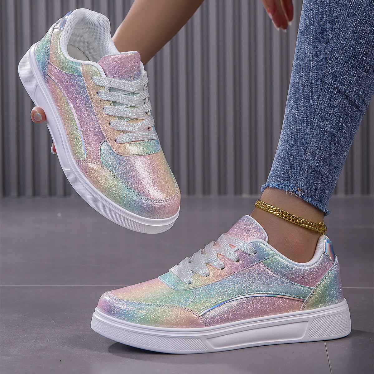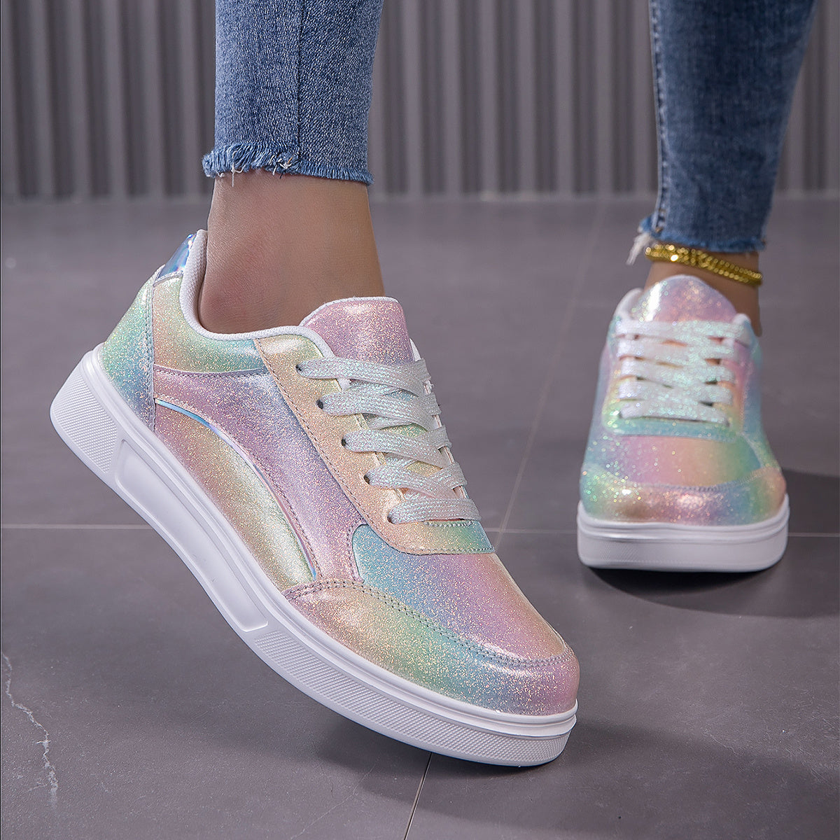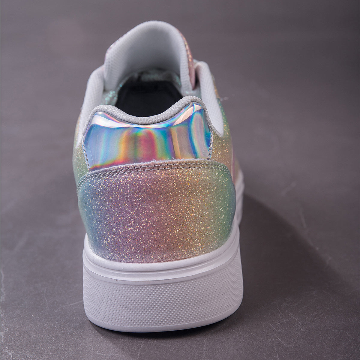 Vibrant Rainbow Holographic Sequin Womens Sneakers - Lightweight, Breathable, Fabric Lined, PU Sole, Microfiber Synthetic Leather Upper - Perfect for Casual, Party, Wedding, Streetwear, and Trendy Fashion Enthusiasts